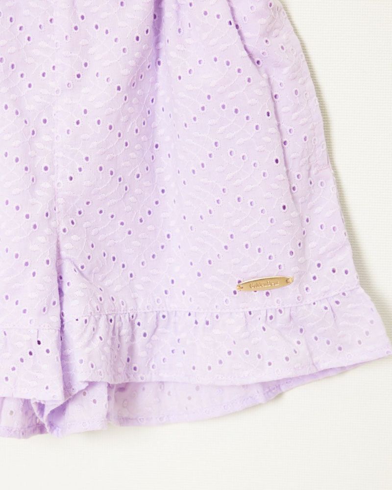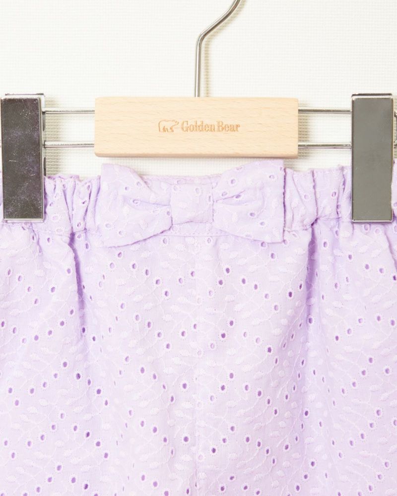 総柄のドビー刺繍の生地を使ったフェミニンスタイルのパンツです。スソのフリルが揺れるキュートなデザインです。ショルダーフリルTシャツ(202J5452)とセットアップをお楽しみいただけます♪ モデル身長: 103 cm 着用サイズ: 100 サイズ セットアップのトップスはこちら Golden Bear KIDS ボトムス (KIDS)