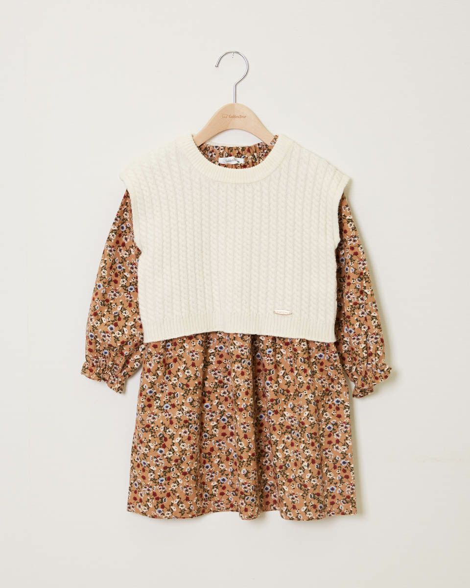 小花プリントをあしらったワンピースと、ケーブルベストがセットでお楽しみいただけます♪