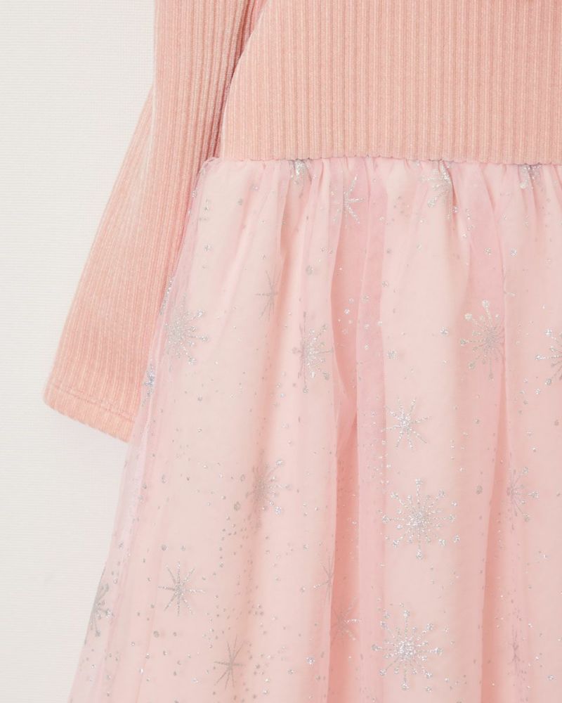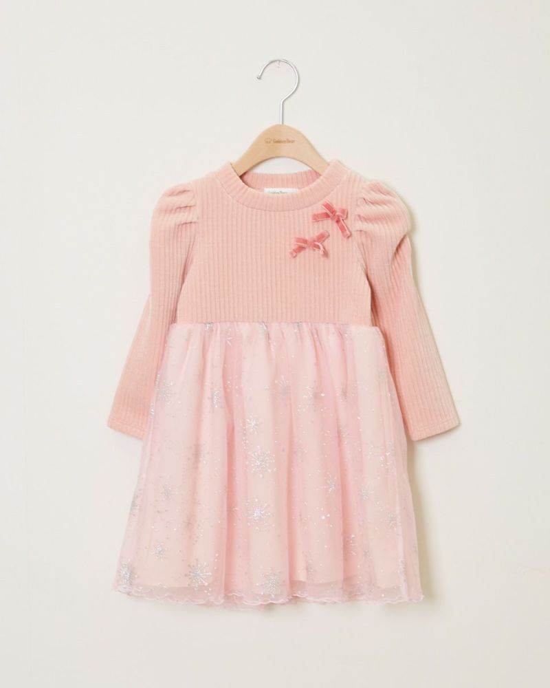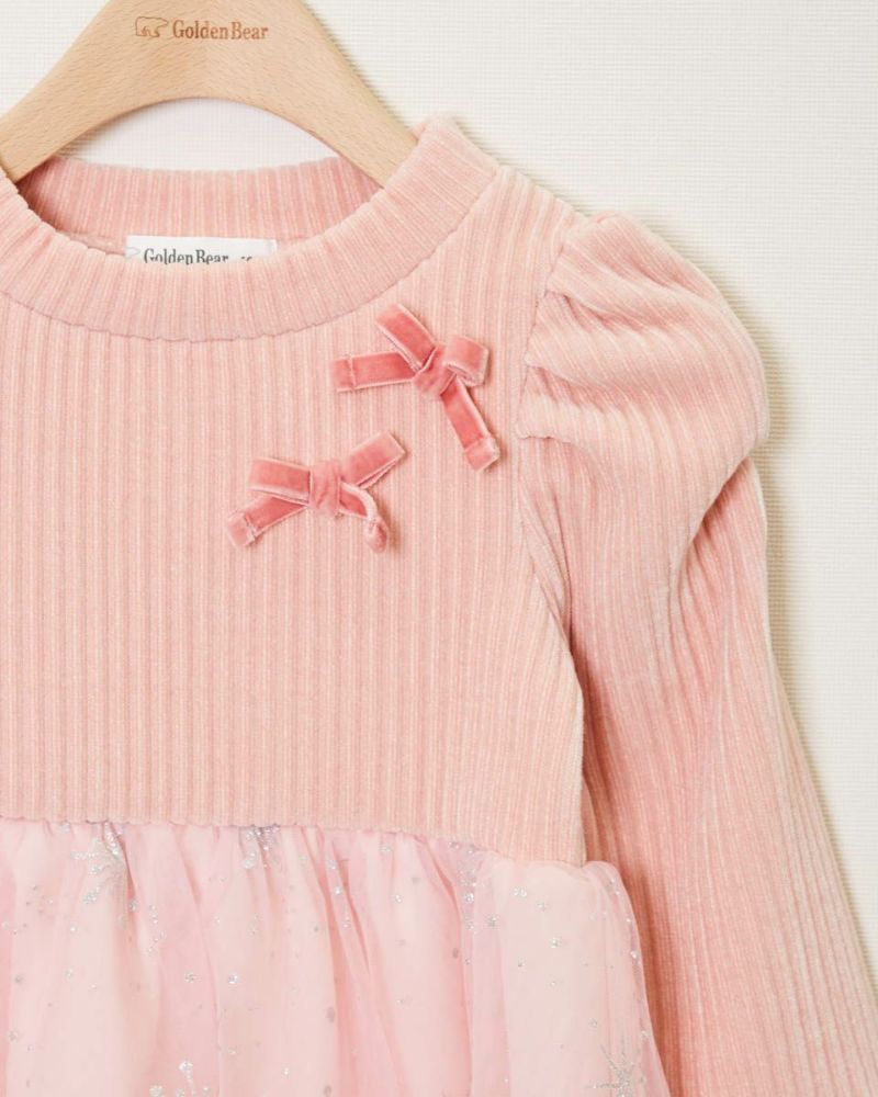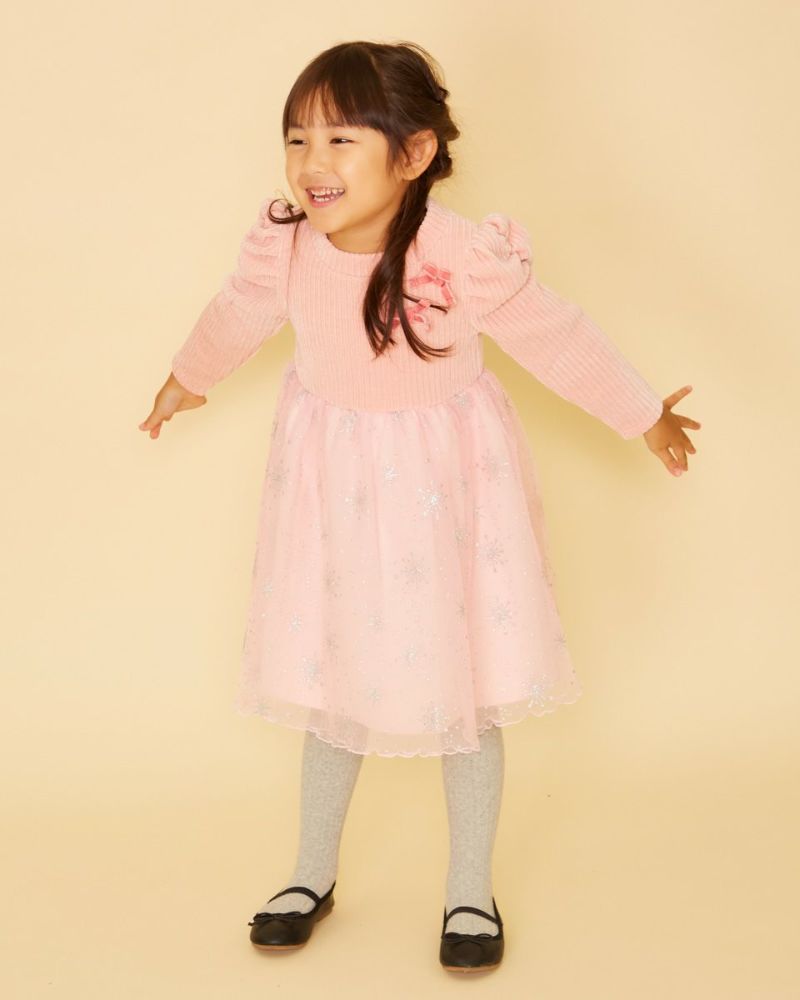 スカートの上に重ねたチュールにはラメプリントが煌めいていて、とても華やかなワンピースに仕上がりました!胸元のリボンもとてもキュートです♪