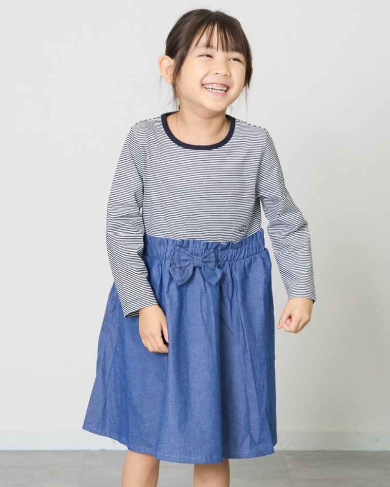 一枚でサマになるボーダー柄切り替えのワンピースです。 シンプルな中にも切替位置にリボン付きチャームを添えてアクセントにしています。 きちんと感があって楽に着られるワンピースは、お出かけにぴったりです。 ガールズモデル身長: 109 cm 着用サイズ: 110 サイズ Golden Bear Kids ワンピース (Kids) 同素材のカットソーはこちら(Kids) 同素材のレディースアイテムはこちら 同素材のメンズアイテムはこちら 家族コーディネートアイテムはこちら