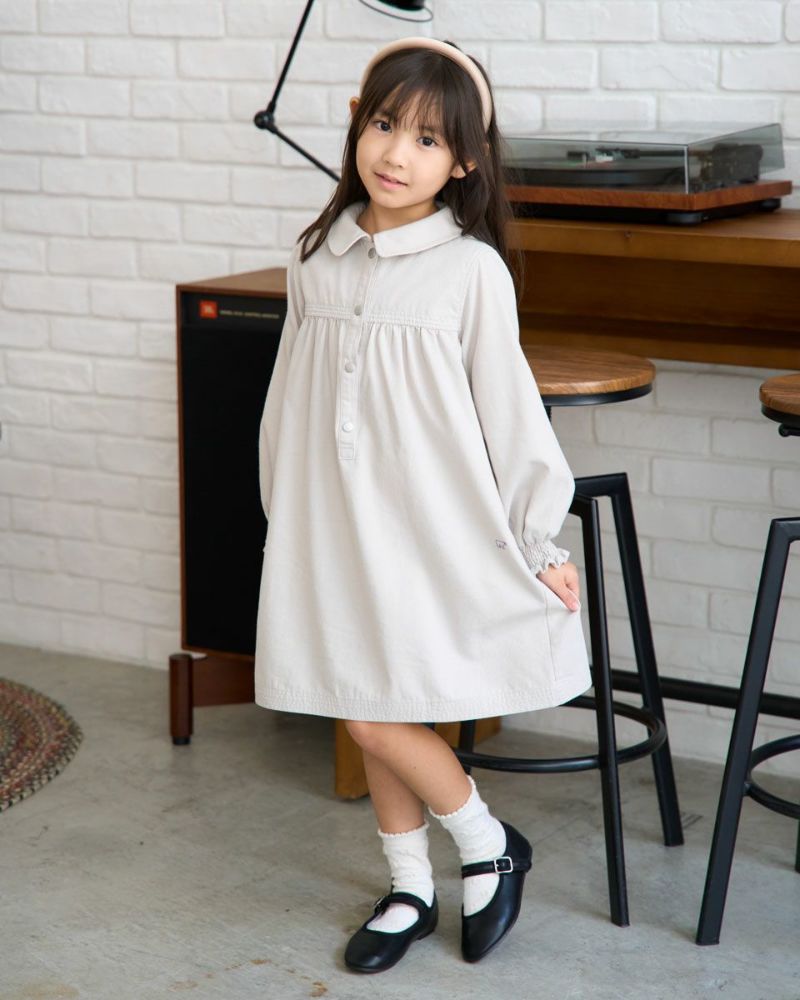 柔らかい素材のデニムです。胸の切り替えが女の子らしいシルエットのワンピース。ヨークと裾のステッチがアクセントになっています。袖口にはシャーリングゴムを使用しているので、袖をまくりやすく、ボリュームのある袖がふんわりとした可愛らしさを演出します。スナップボタン仕様で、着脱もラクラク。
