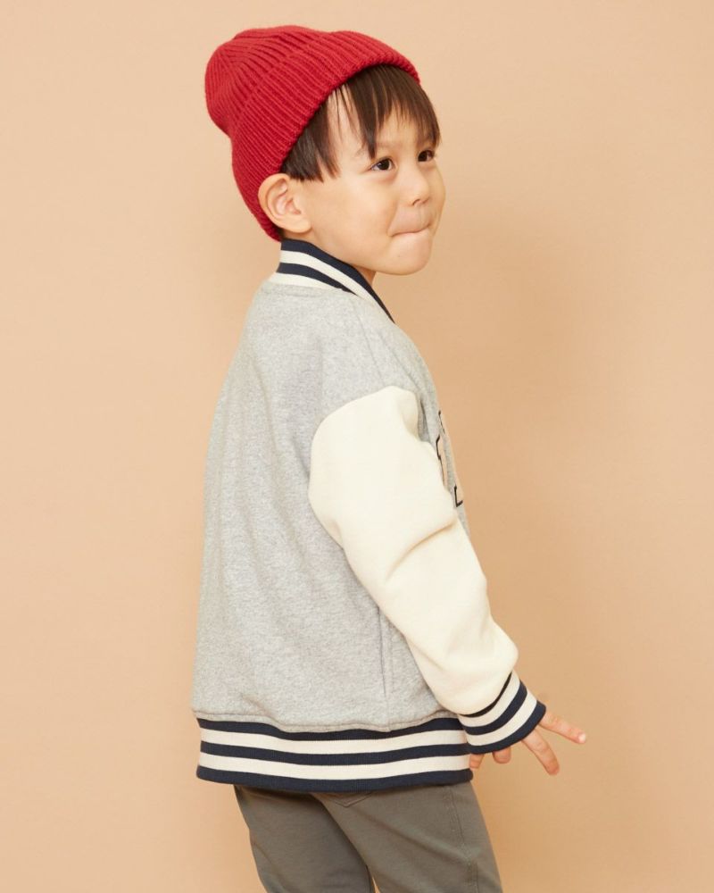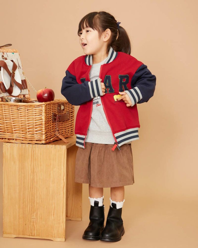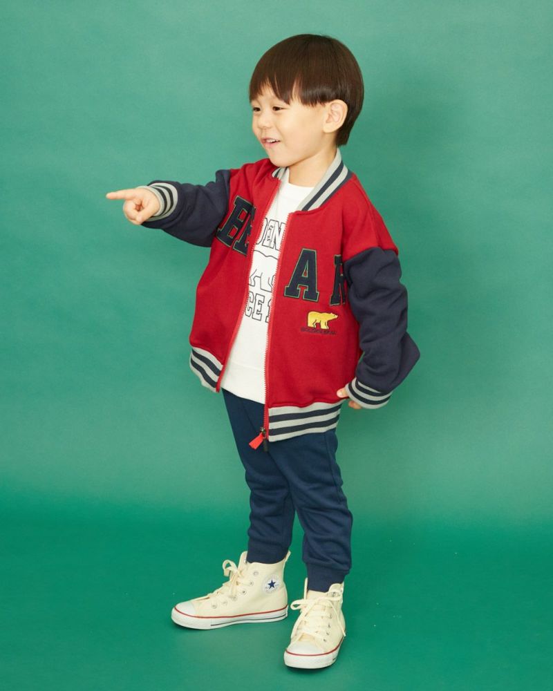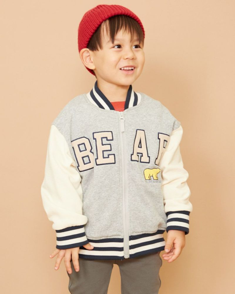 肉感のある裏毛素材を使用したブルゾンです。 身頃と袖を配色使いにし、リブもボーダー柄を採用。ポケット付き。 フロントには『BEAR』のワッペンとGBのアイコンであるベアが印象的で、アメカジの雰囲気を盛り込んだアクティブな羽織に仕上げました。 男の子、女の子兼用でご利用いただけます。