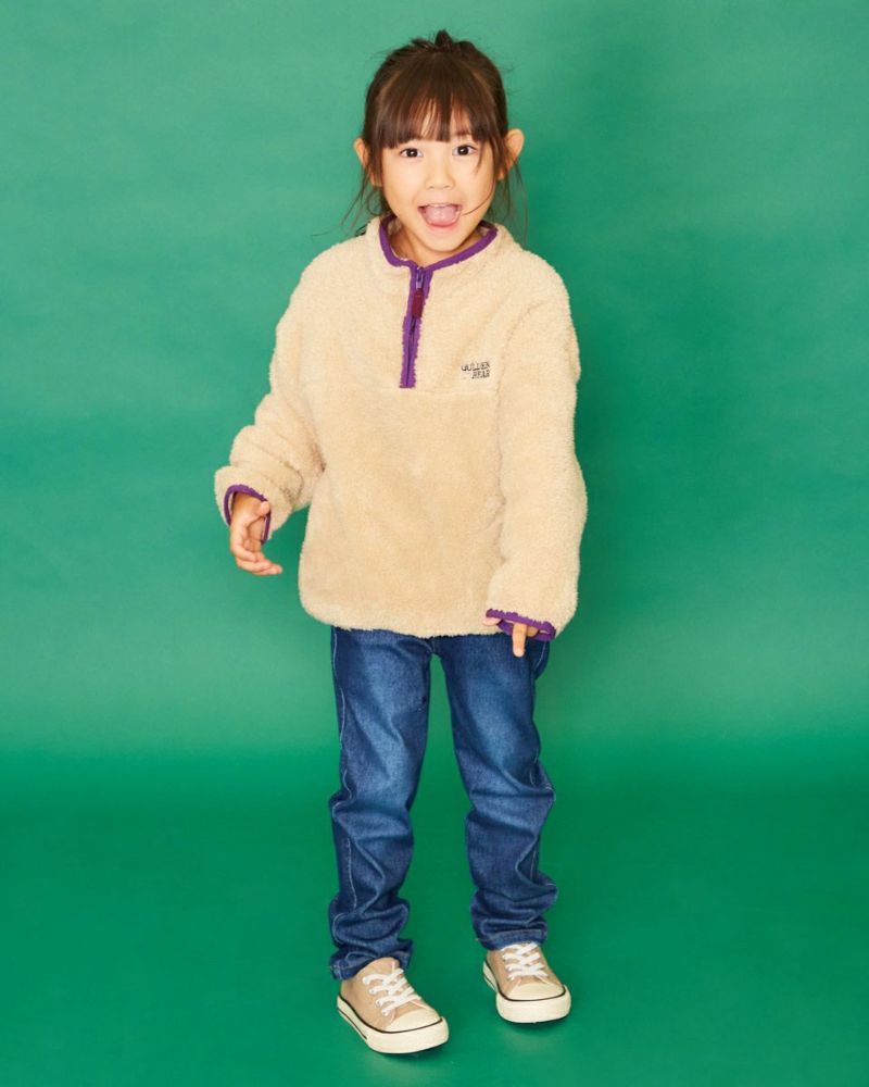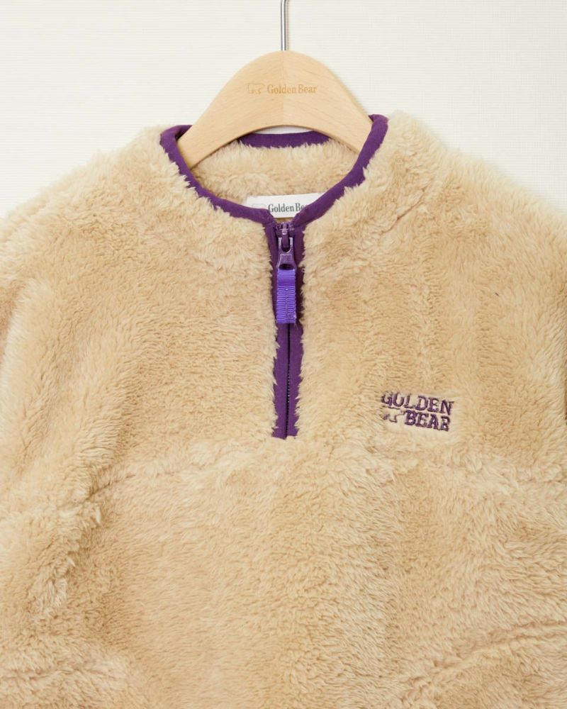 ふわふわのボアフリースを使用したプルオーバーです。 襟元はZIPアップ仕様ですぽっと簡単に着用可能。 パイピングの配色がメリハリを利かせています♪ 軽くて暖かなフリース素材はアウトドアでも大活躍です! 男の子、女の子兼用でご利用いただけます。