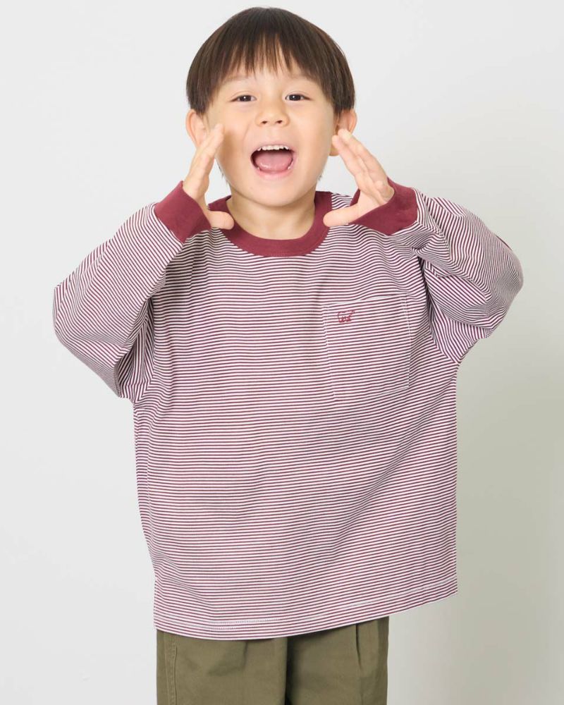 さらっとして肌なじみの良い綿100%の天竺を使用したミジンボーダーのTシャツです。 均等なボーダーがアクセントに、一枚でもインナーとしても使えます。 袖と襟の引き締め配色カラーもポイントです。 モデル身長: 108 cm 着用サイズ: 120 サイズ カットソー (Kids) ワンピース (Kids)はこちら レディースサイズはこちら メンズサイズはこちら 家族コーディネートアイテムはこちら