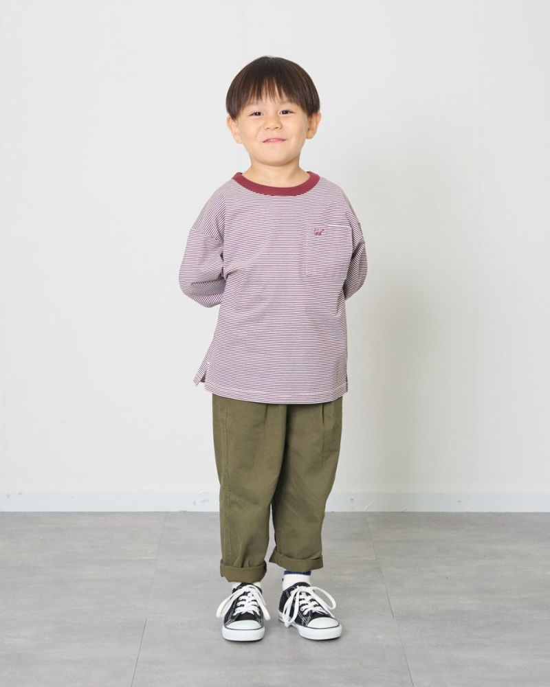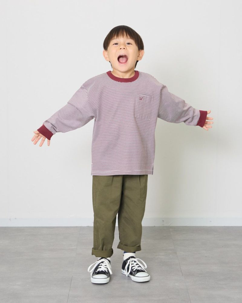 さらっとして肌なじみの良い綿100%の天竺を使用したミジンボーダーのTシャツです。 均等なボーダーがアクセントに、一枚でもインナーとしても使えます。 袖と襟の引き締め配色カラーもポイントです。 モデル身長: 108 cm 着用サイズ: 120 サイズ カットソー (Kids) ワンピース (Kids)はこちら レディースサイズはこちら メンズサイズはこちら 家族コーディネートアイテムはこちら