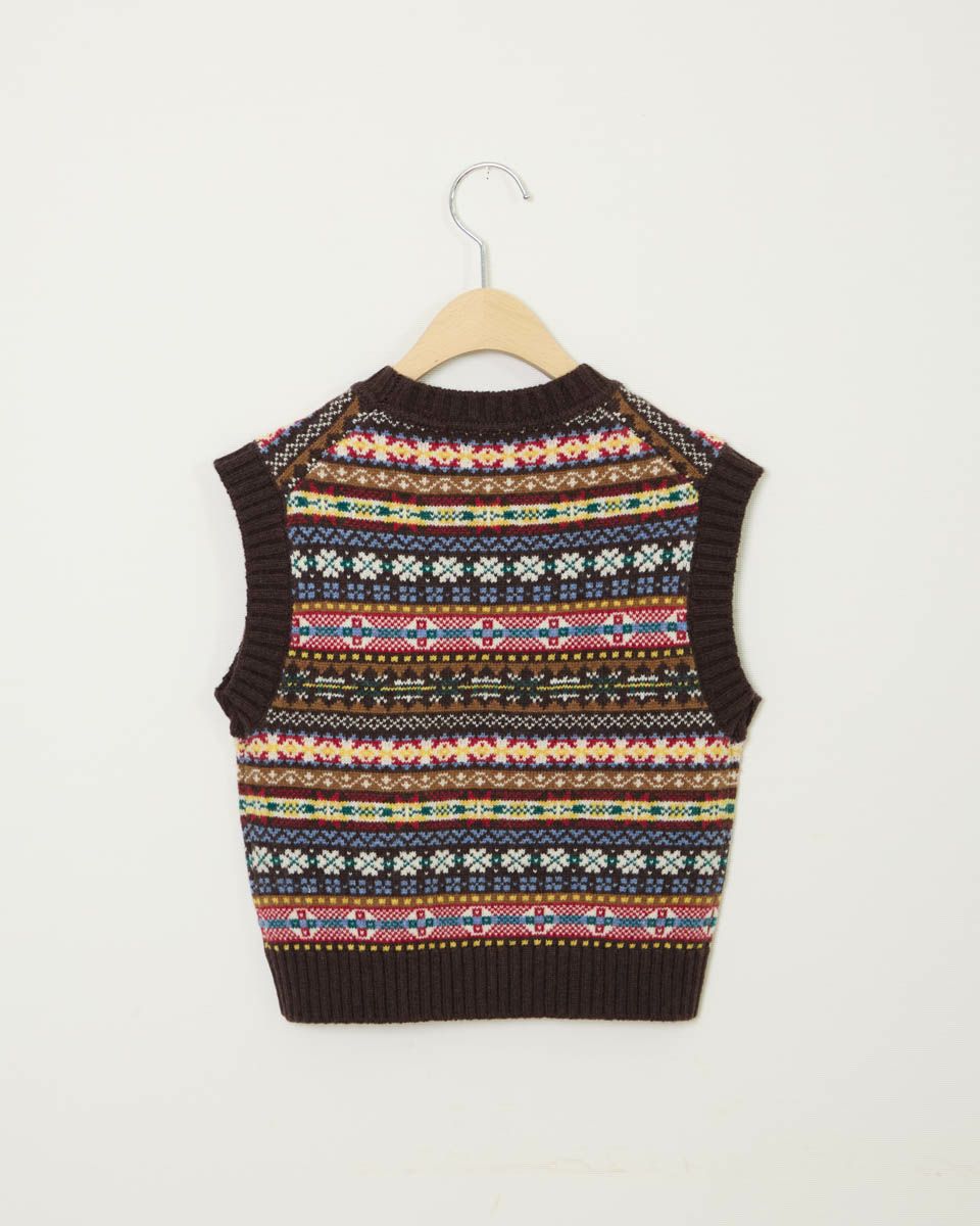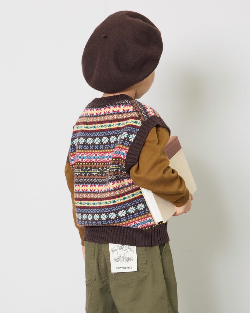 どこか懐かしく温かみのあるフェアアイル柄のニットベストです。 シャツやカットソーとのレイヤードで、寒い季節のコートインにもちょうどいいアイテムです。 ファミリー企画としておそろいの素材感で展開しています。 ボーイズモデル身長: 108 cm 着用サイズ: 110 サイズ ニット (KIDS) 同素材のウィメンズはこちら 同素材のメンズはこちら 家族コーディネートアイテムはこちら