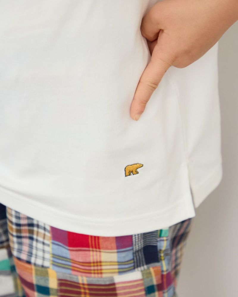さがら刺繍でGOLDENBEARロゴを入れたTシャツです。接触冷感・透け防止・吸水速乾性に優れ、滑らかな肌触りが特長のGB天竺を使用しています。襟ぐりは強度のあるフライスを使用し、バインダー始末にすることでヨレにくいのが特徴です。