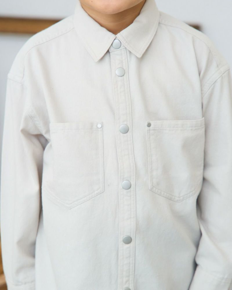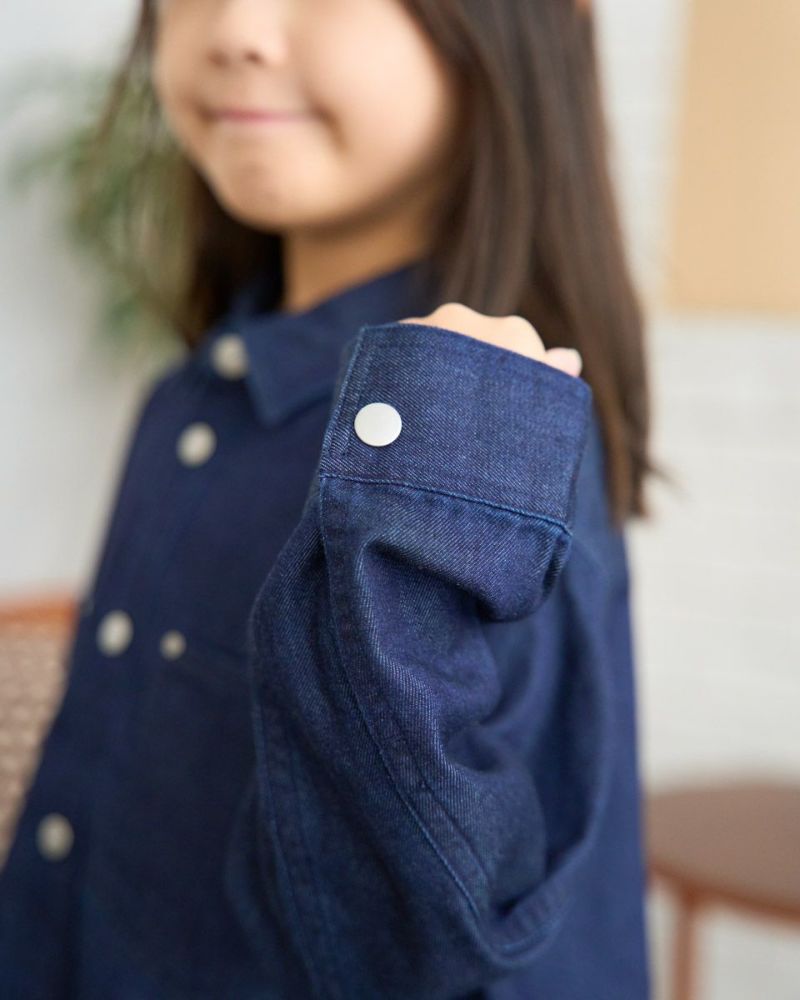 柔らかい素材でちょっとした羽織としても使いやすいアイテムです。ゆとりを持たせたシルエットです。脱ぎ着しやすく、成長に合わせて長く着られるのも嬉しいポイントです。カジュアルすぎないメタル釦がアクセントで、着脱も簡単にできる使用にしています。 ボーイズモデル身長: 117 cm 着用サイズ: 120 サイズ ガールズモデル身長: 119 cm 着用サイズ: 120 サイズ Golden Bear Kids ブラウス (Kids) キッズ同素材はこちら レディース同素材はこちら 家族コーディネートアイテムはこちら