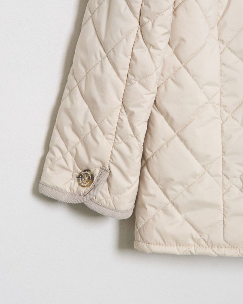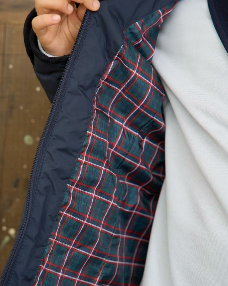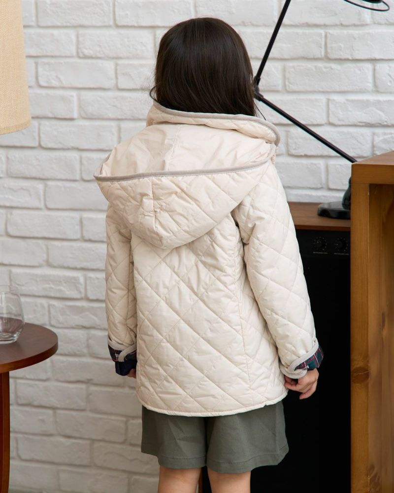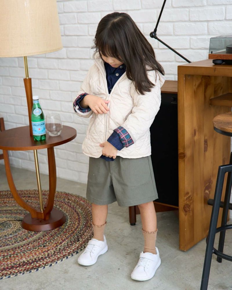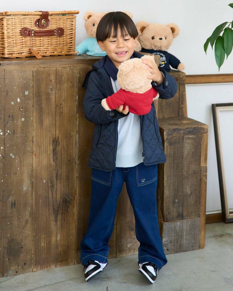 毎年ご好評いただいているキルトジャケットです。中綿にはソフトな風合いと膨らみを持たせる植物由来の素材を一部配合することで耐久性と保温性を高めました。コーデュロイの配色パイピングがポイントです。フードはファスナーで取り外しが出来ます。前中心はファスナー開きで男女兼用で着用頂けます。裏地はゴールデンベアオリジナルのチェック柄プリントを使用しています。ご家庭の洗濯機で洗えて、いつでも清潔に着用いただけます。