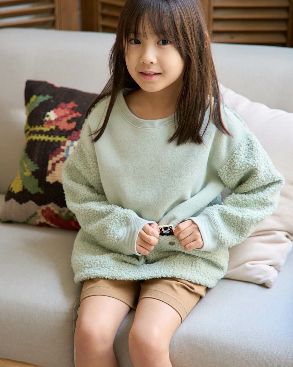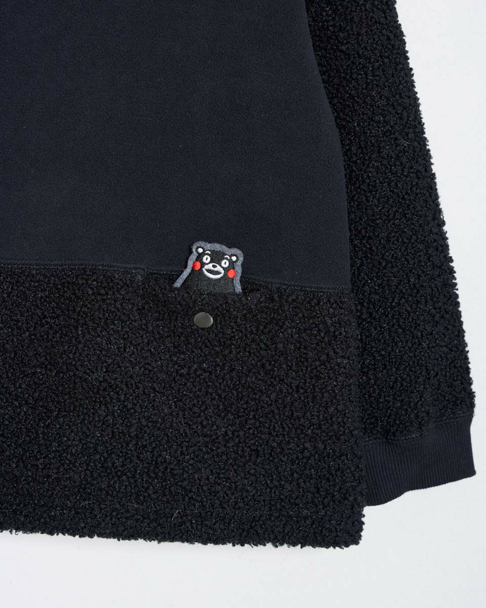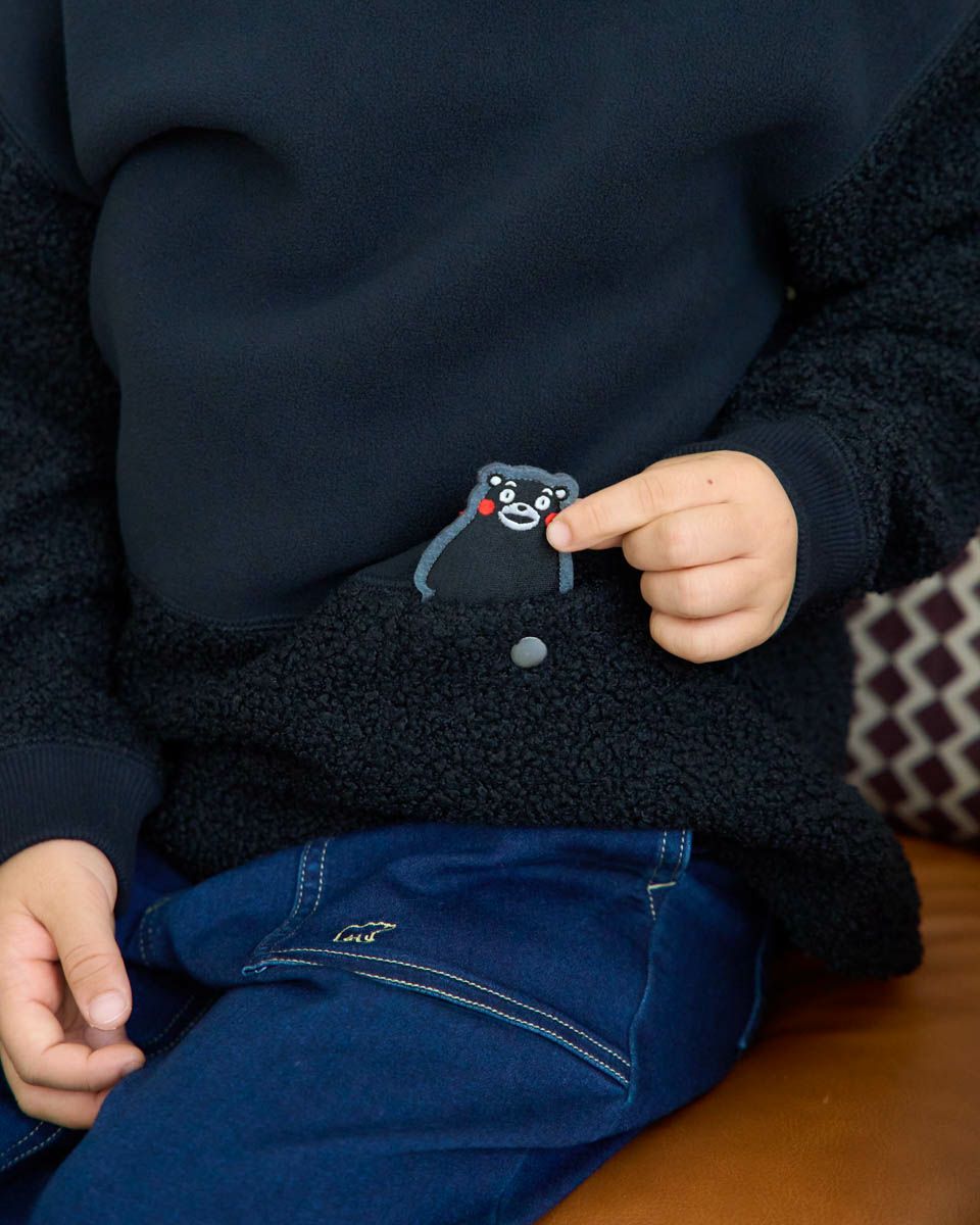 熊本県の人気マスコット“くまモン”をモチーフにしたワッペンがポイントのボアフリースプルオーバー。ふんわりとしたボアと滑らかなフリースの異素材切替で、見た目にも楽しいデザインに仕上げました。ポケットには、さりげなくくまモンが忍ばせてあり、取り外し可能なので気分に合わせてアレンジも楽しめます。