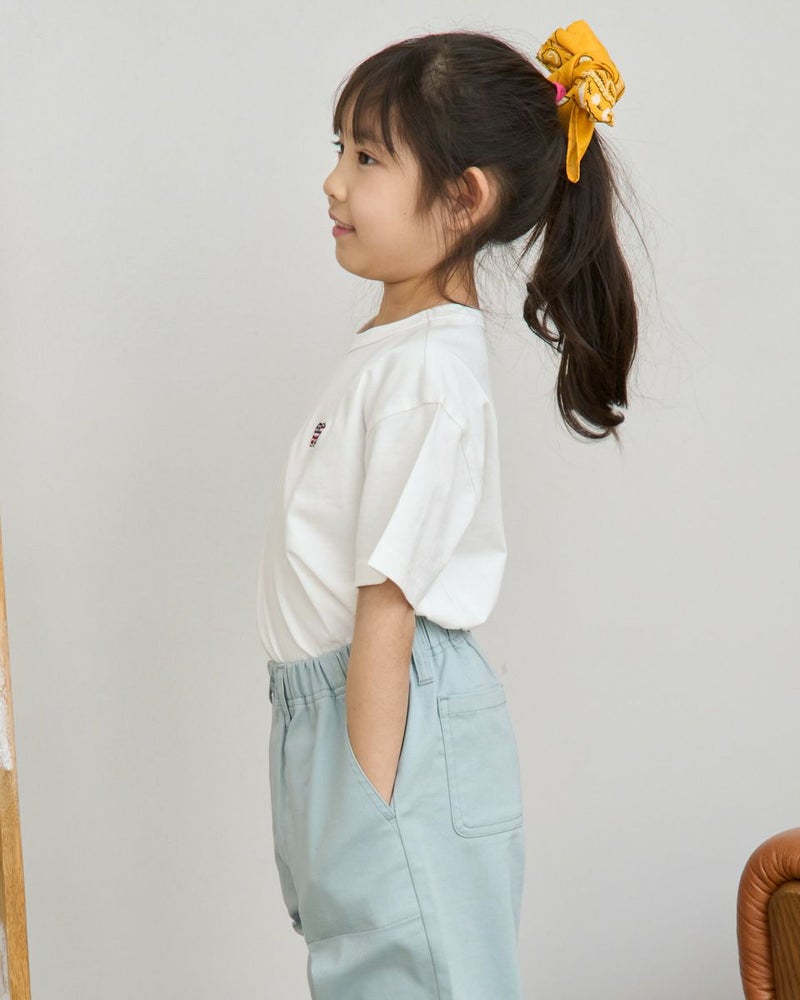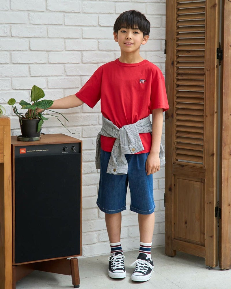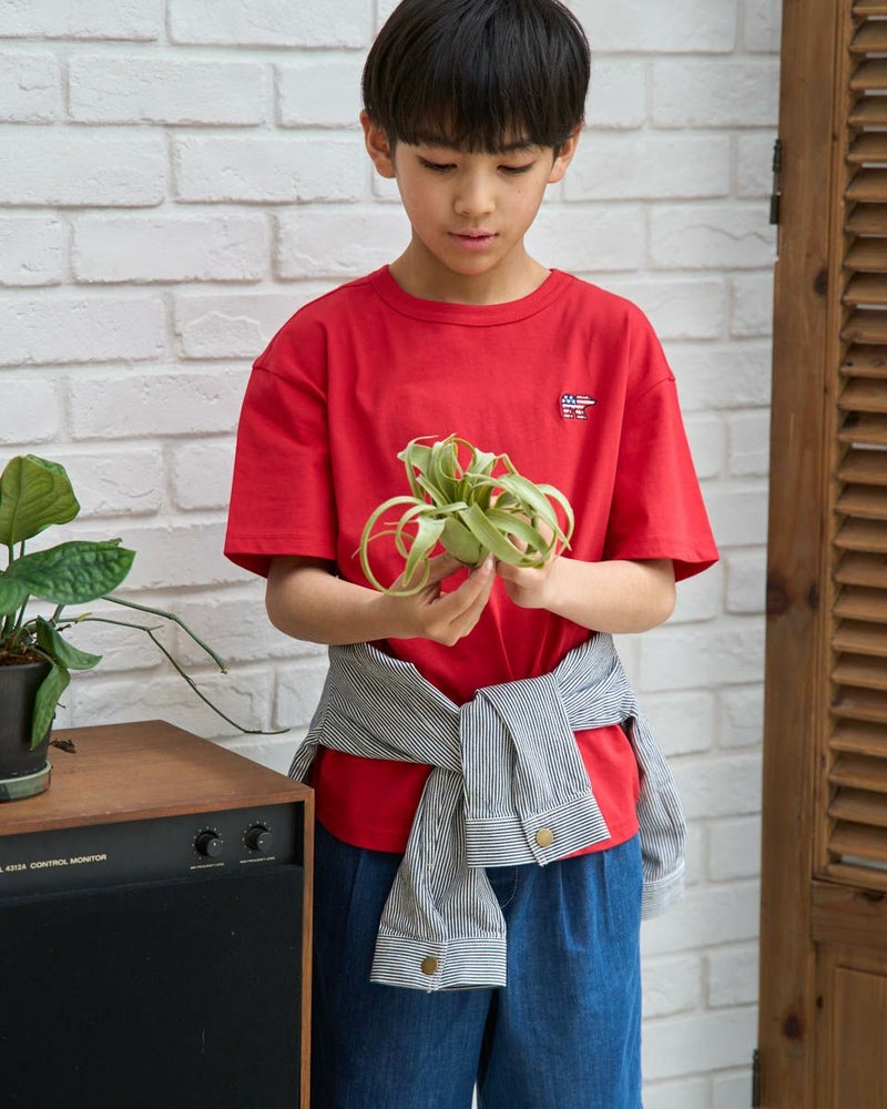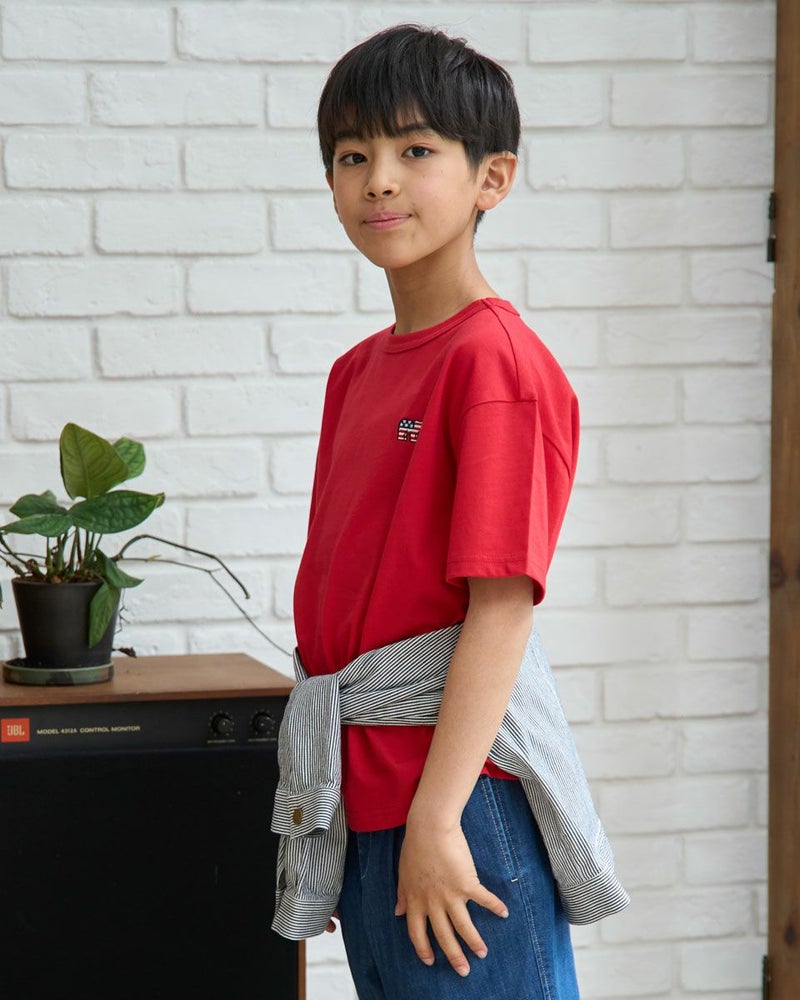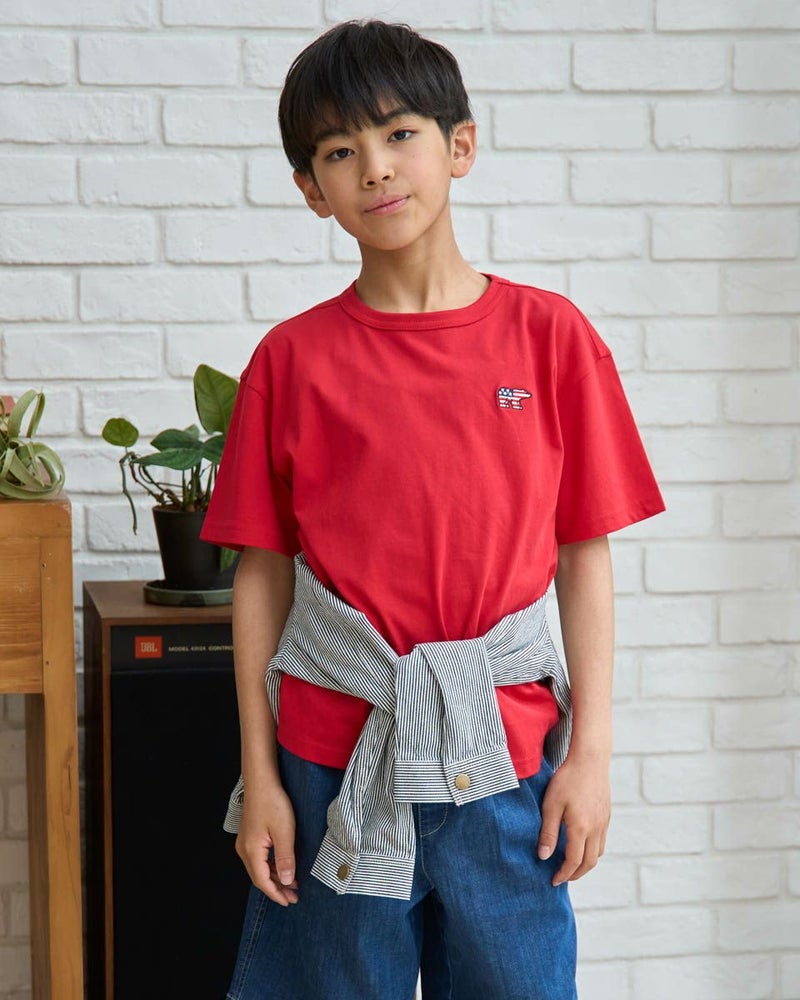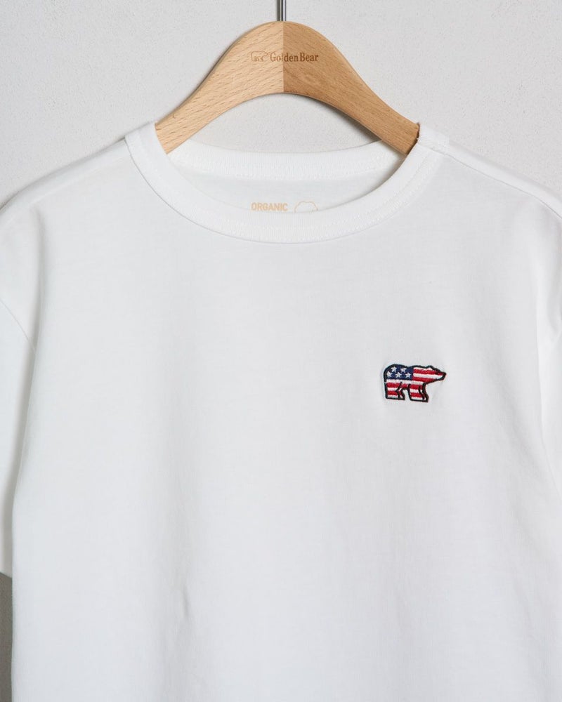 お子様の元気な毎日に、Golden Bearの遊び心あふれる一枚を。星条旗をモチーフにしたくま刺しゅうが目を引くデザイン。主役級の可愛さがありながら、どんな服にも合わせやすいシルエットで、毎日のコーディネートをパッと明るく、ワクワクするものに変えてくれます。素材は、お子様の肌に優しいオーガニックコットン100%。ふんわりと柔らかな肌ざわりが、敏感なお子様の素肌を心地よく包み込み,安心感を与えてくれます。通気性にも優れているので、汗っかきなお子様も一日中さらさら。デニムと合わせた王道スタイルから、お出かけ用のインナーとしても大活躍。お洗濯にも強く、お気に入りの一着として長く大切に着ていただけます。質の良さと可愛さを兼ね備えたTシャツです。