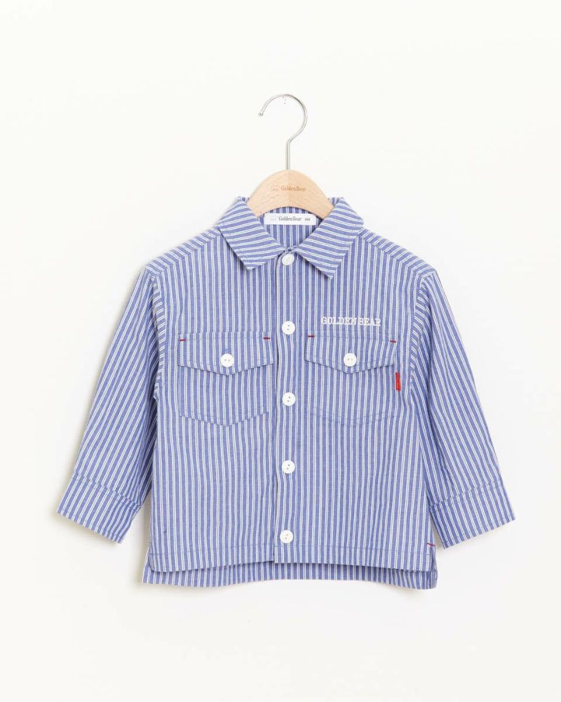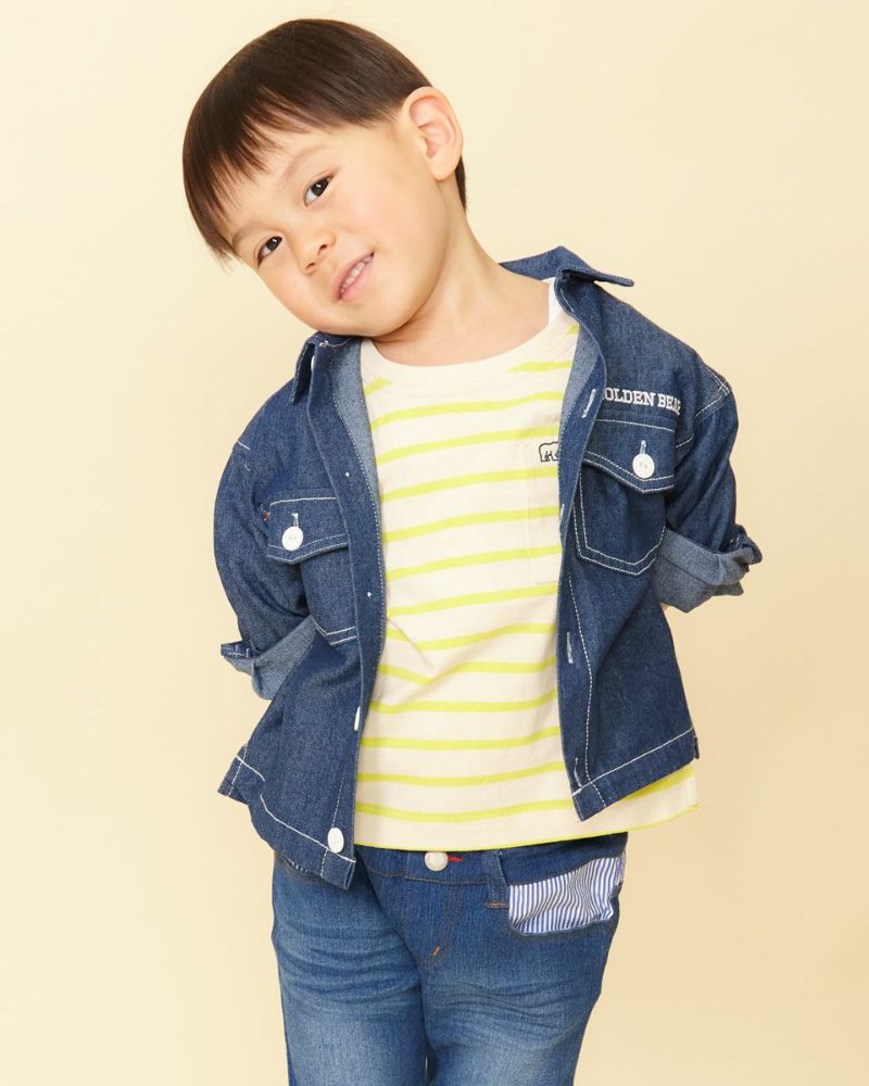 春先のコーディネートにぴったりのライトなデニムGジャンです。胸元の大きなポケットが特徴です♪中にTシャツを着て、袖をまくってもステキですよ!コートとシャツの間くらいの肉感のため軽く、春の日差しが暖かな日におすすめです!ストライプとデニムの2色展開です。 モデル身長: 99 cm 着用サイズ: 100 サイズ Golden Bear Kids ブラウス (Kids)