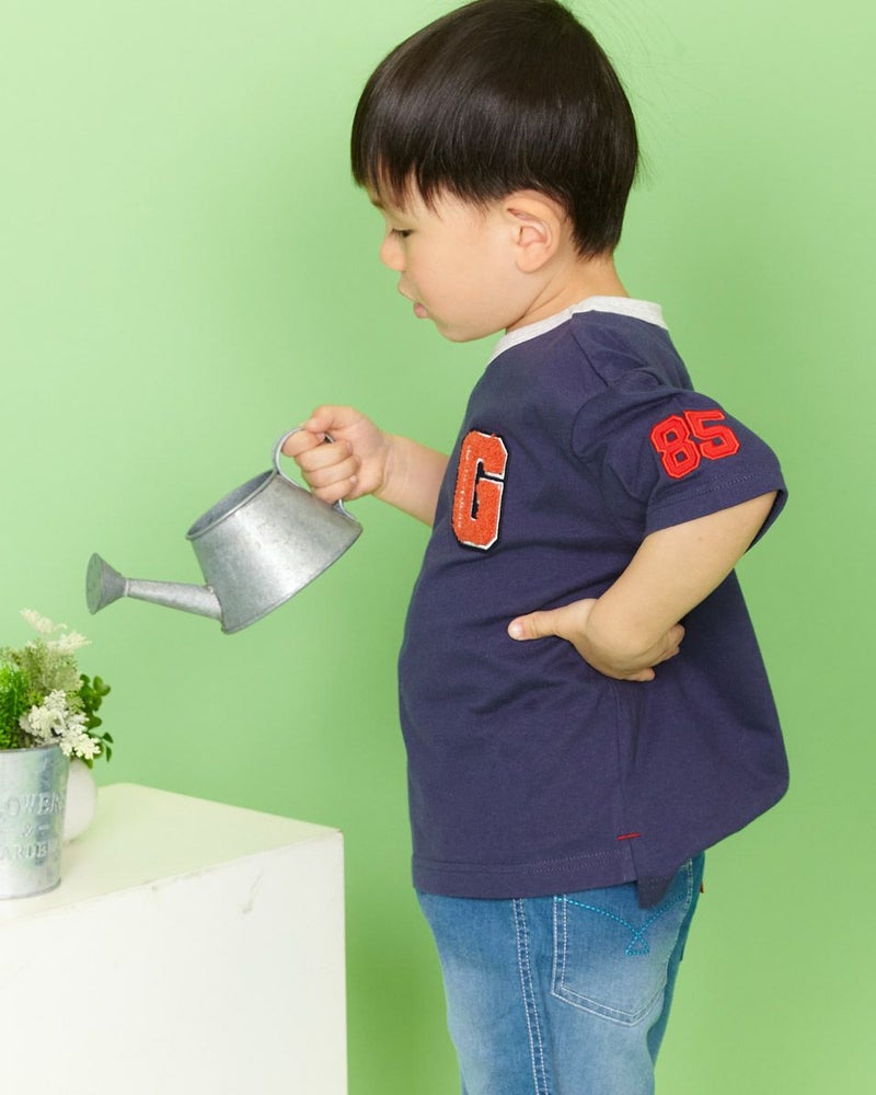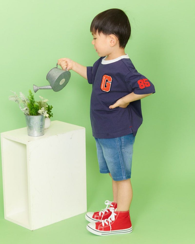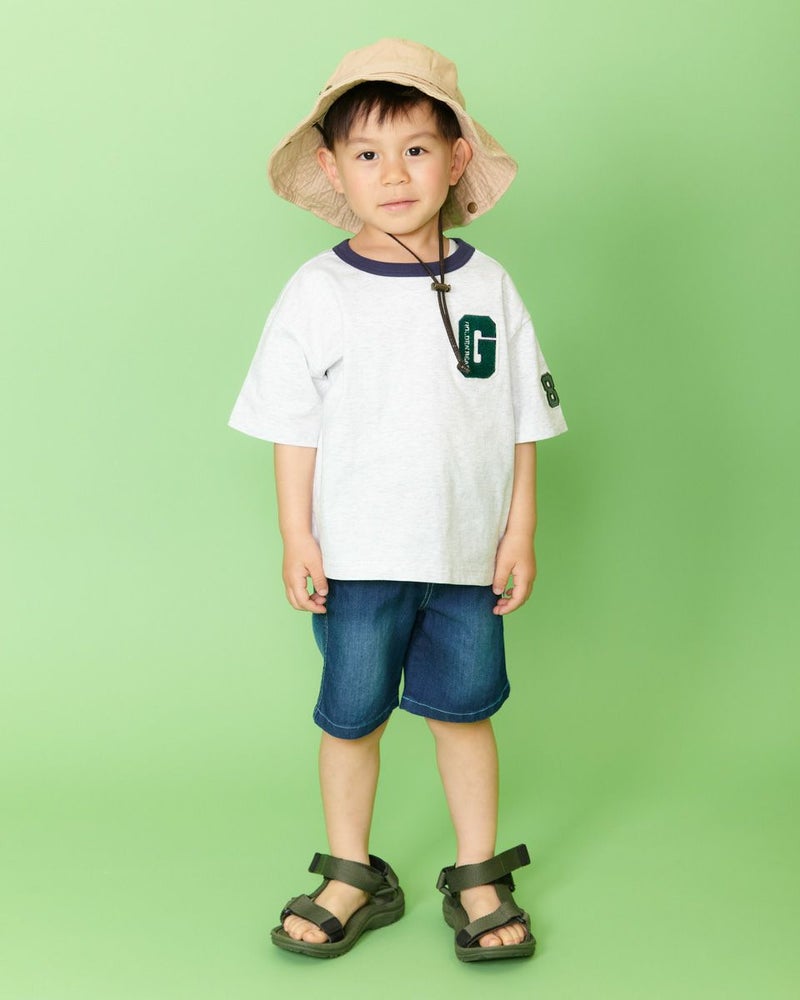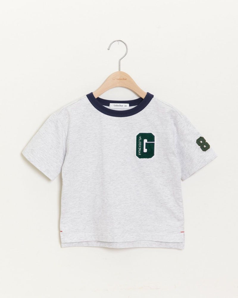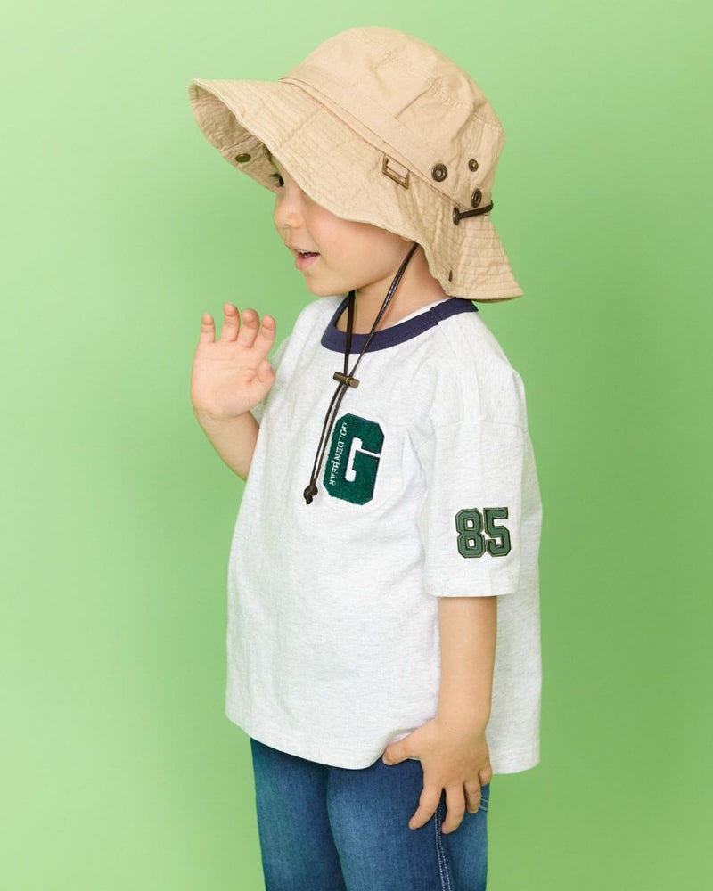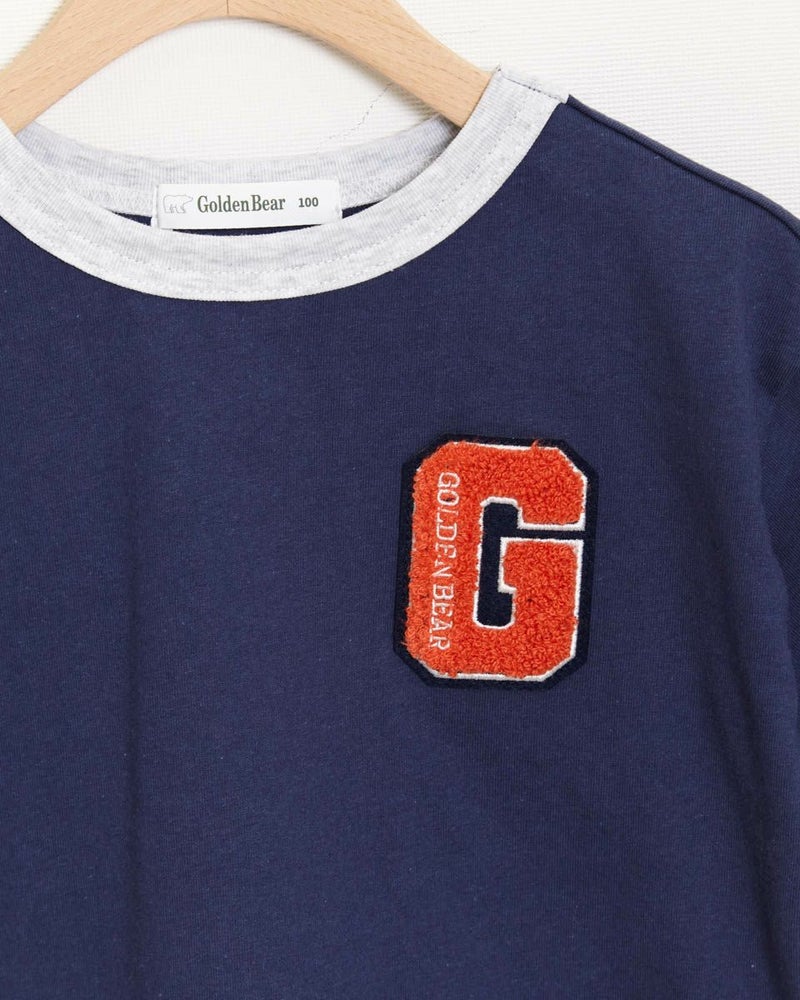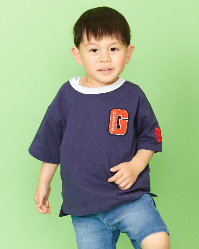 胸元のパイル生地のエンブレムがポイントのTシャツです!少し肩落ちのゆったりめシルエットで、デニムとの相性も抜群♪袖のナンバーアップリケも自慢の1着です! モデル身長: 99 cm 着用サイズ: 100 サイズ Golden Bear KIDS カットソー (KIDS)