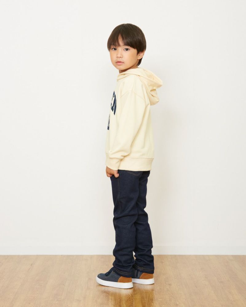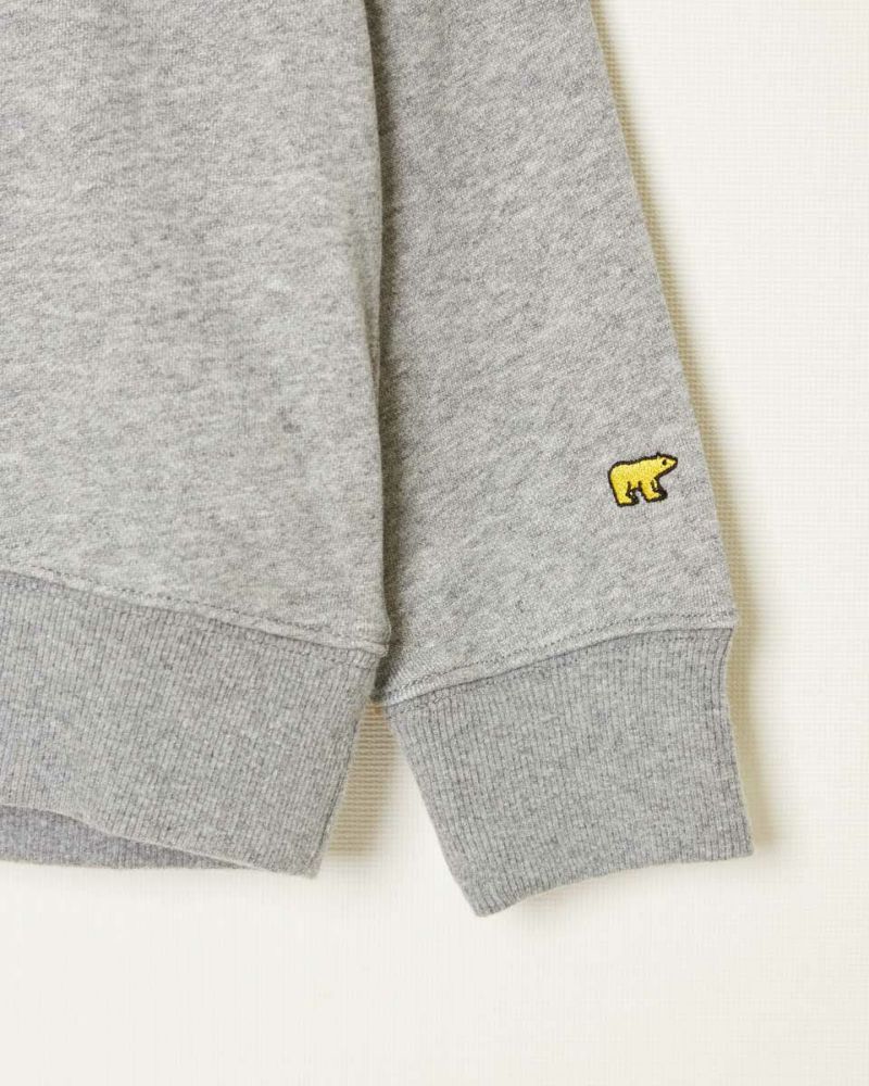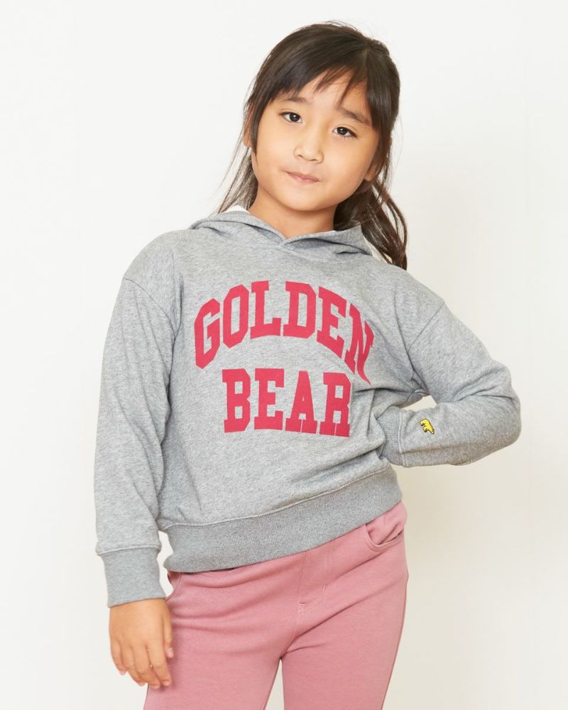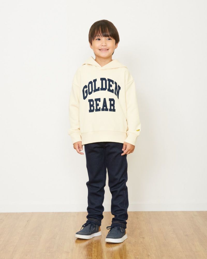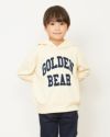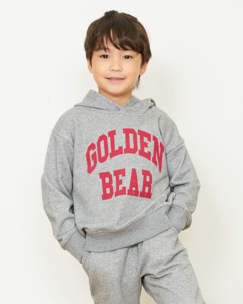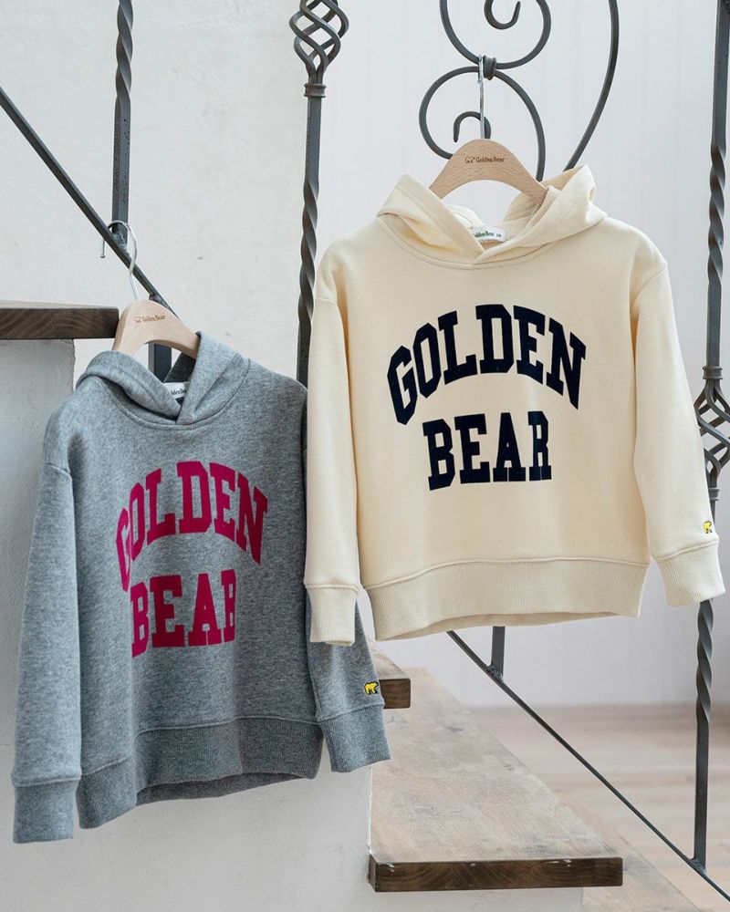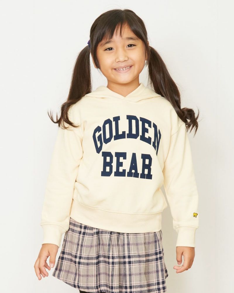 やわらかく肌触りの良い裏毛素材を使用したパーカです。GOLDEN BEARの文字をカレッジロゴ風にデザインアレンジしました。フロントのフロッキープリントにはボディカラーに合わせて映える色を採用しています。シンプルながら存在感のあるアイテムです。BOYS、GIRLS共用でお召しいただけます。