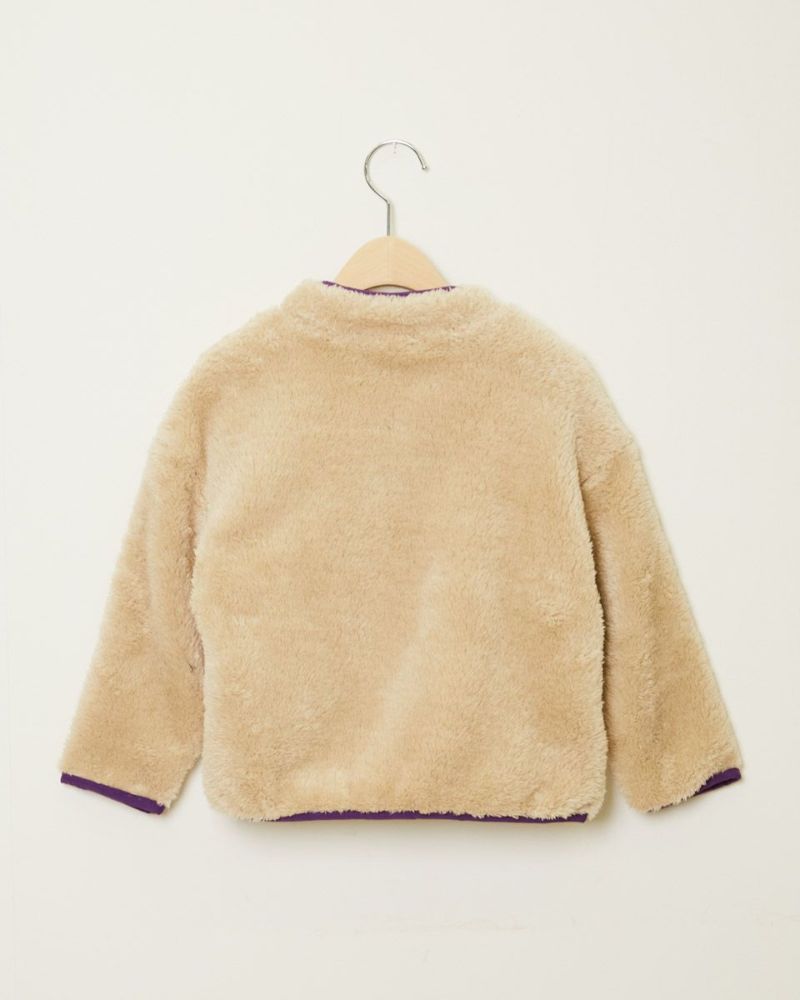 ふわふわのボアフリースを使用したプルオーバーです。 襟元はZIPアップ仕様ですぽっと簡単に着用可能。 パイピングの配色がメリハリを利かせています♪ 軽くて暖かなフリース素材はアウトドアでも大活躍です! 男の子、女の子兼用でご利用いただけます。