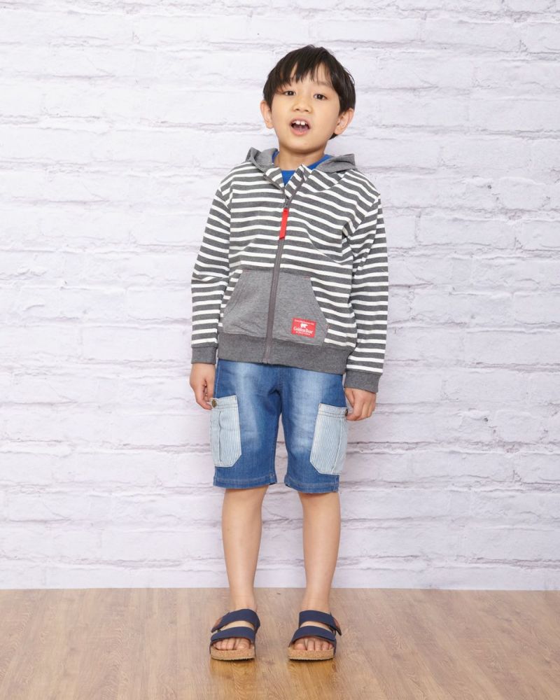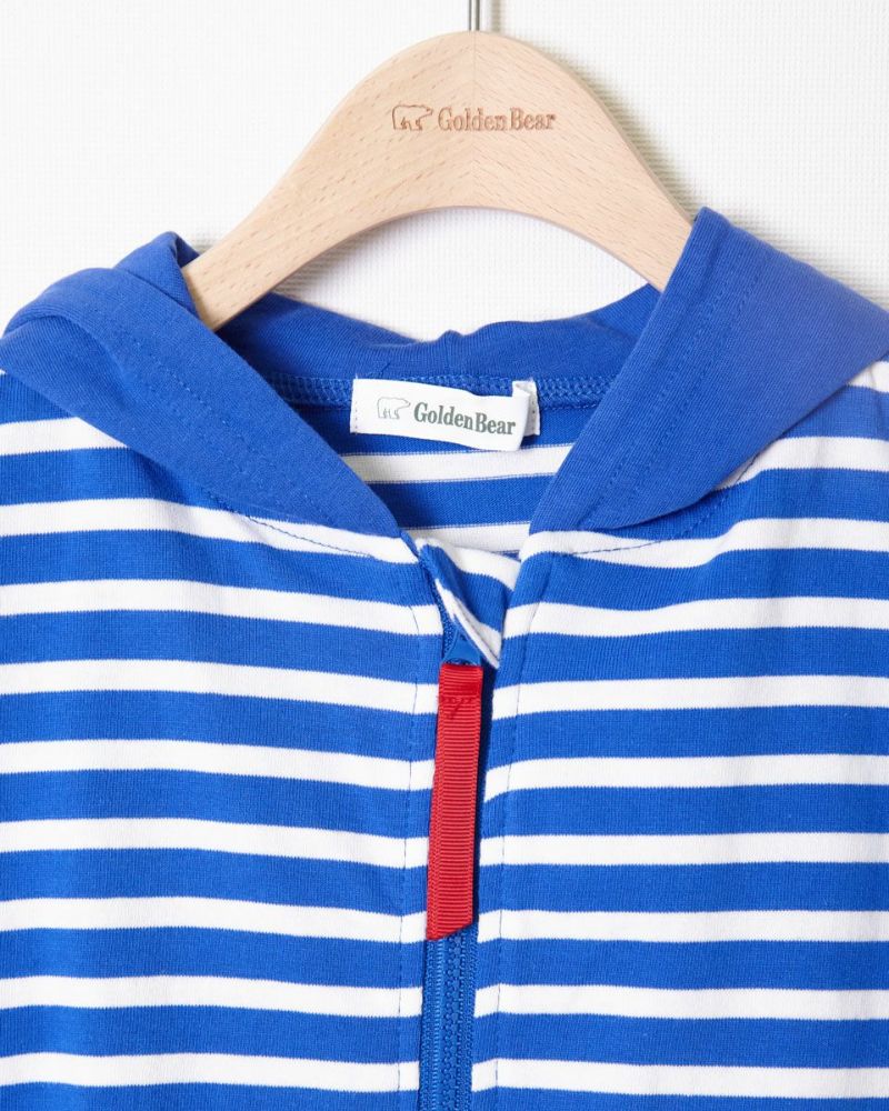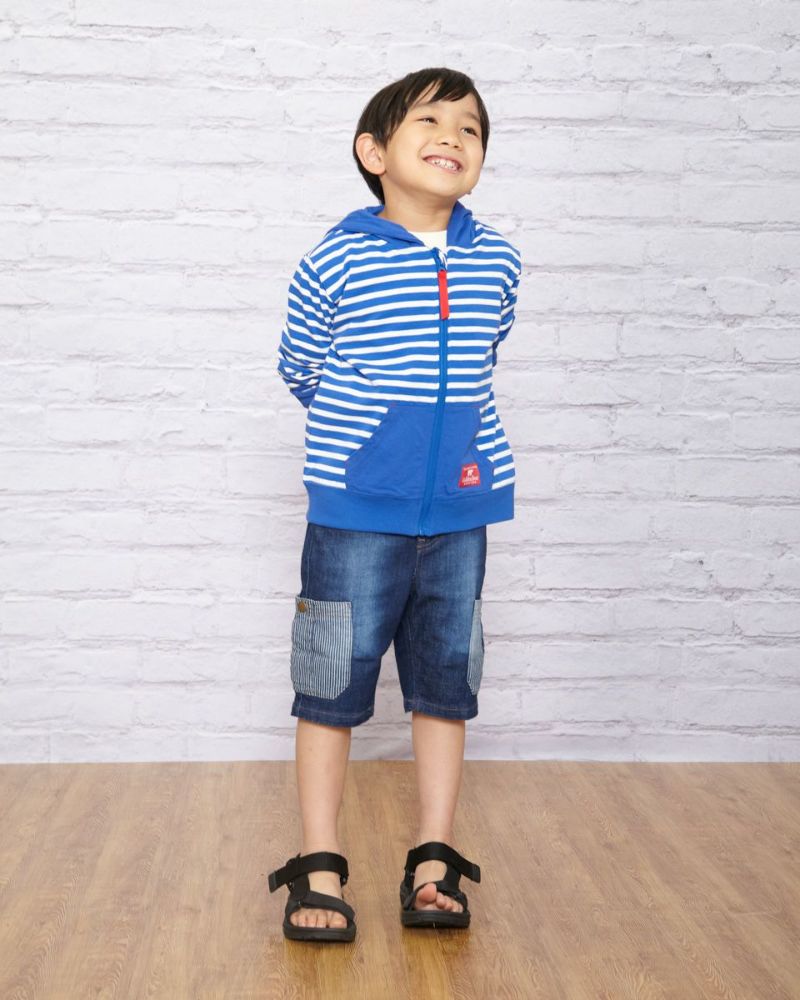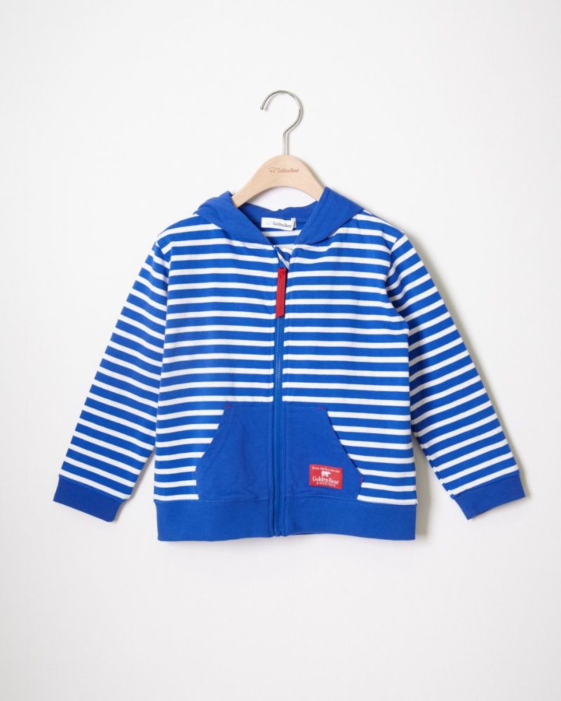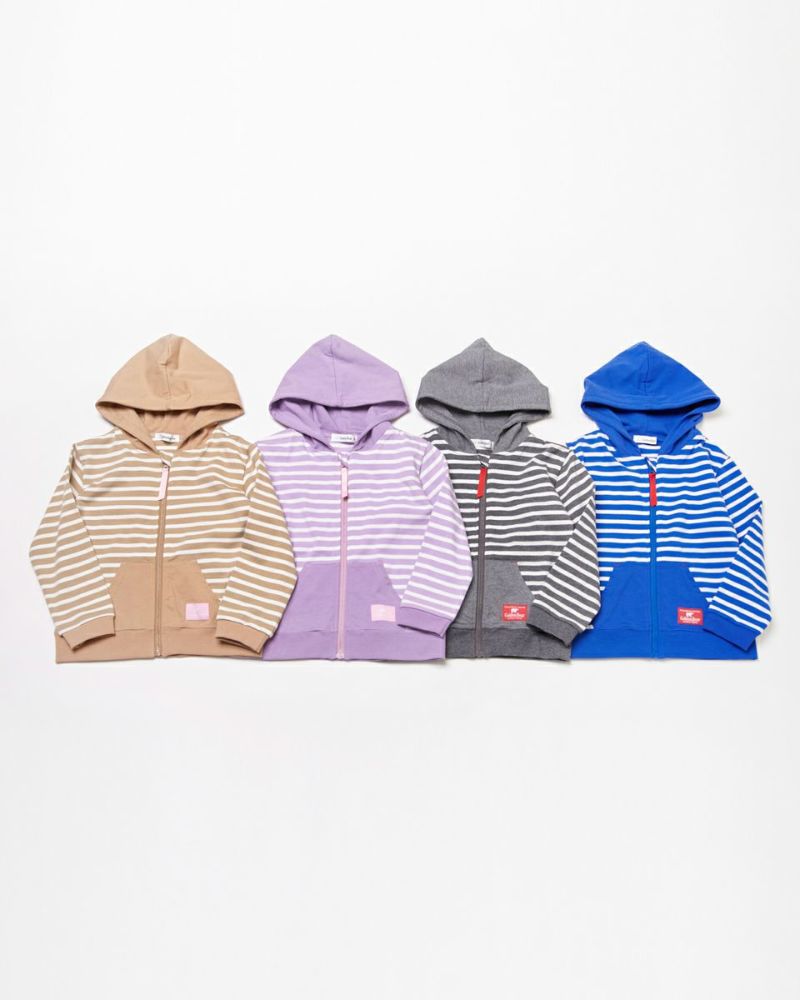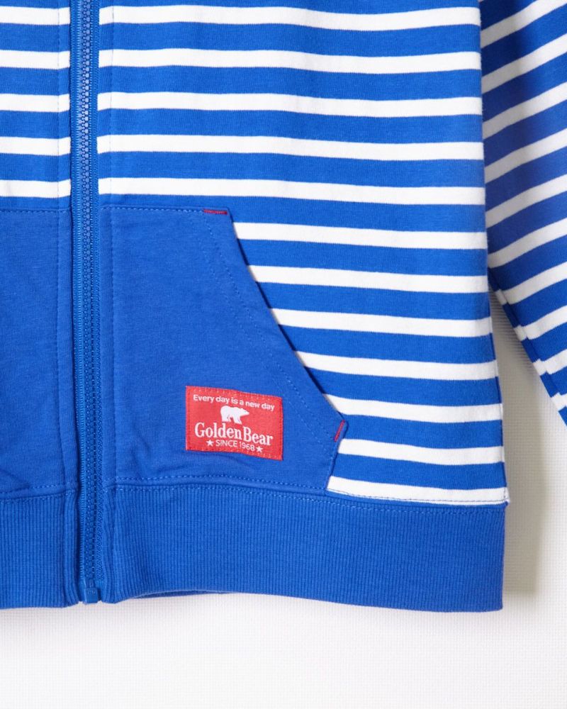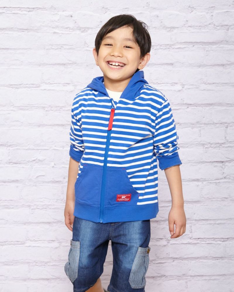 元気カラーのボーダー柄パーカです。デニムアイテムと相性抜群!配色のポケットが自慢です。色違いでGirlsも展開しております。(201D3402)