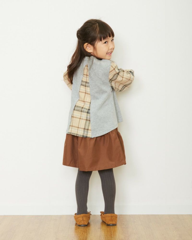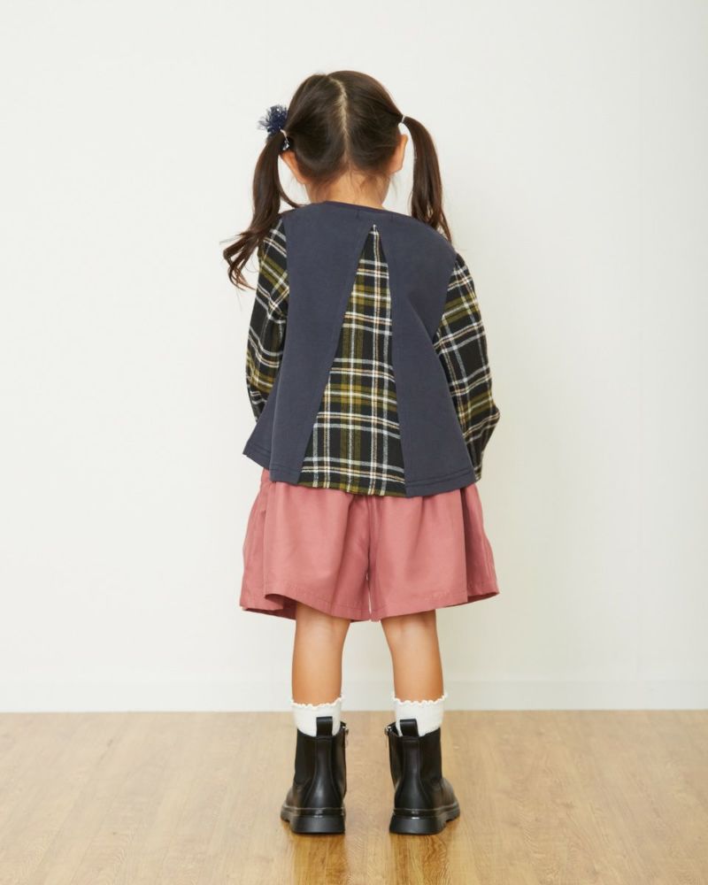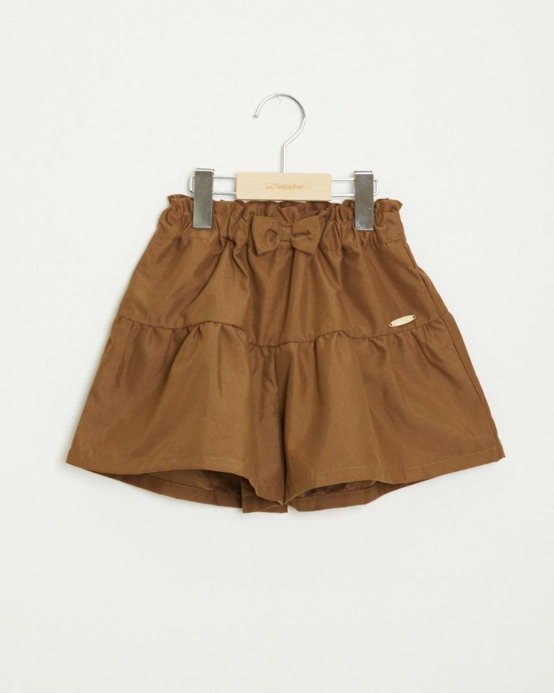 ウエストのリボンと切替ティアードがとてもかわいいキュロットです。ウエストゴム使いの穿きやすく、やわらかく肌触りのよいスエード素材を使用しています。両脇にポケット付き。Golden Bearのロゴをあしらったゴールドのロゴプレートもよいアクセントになっています。甘めのピンクとアクティブな印象にもなるモカの2色展開です。