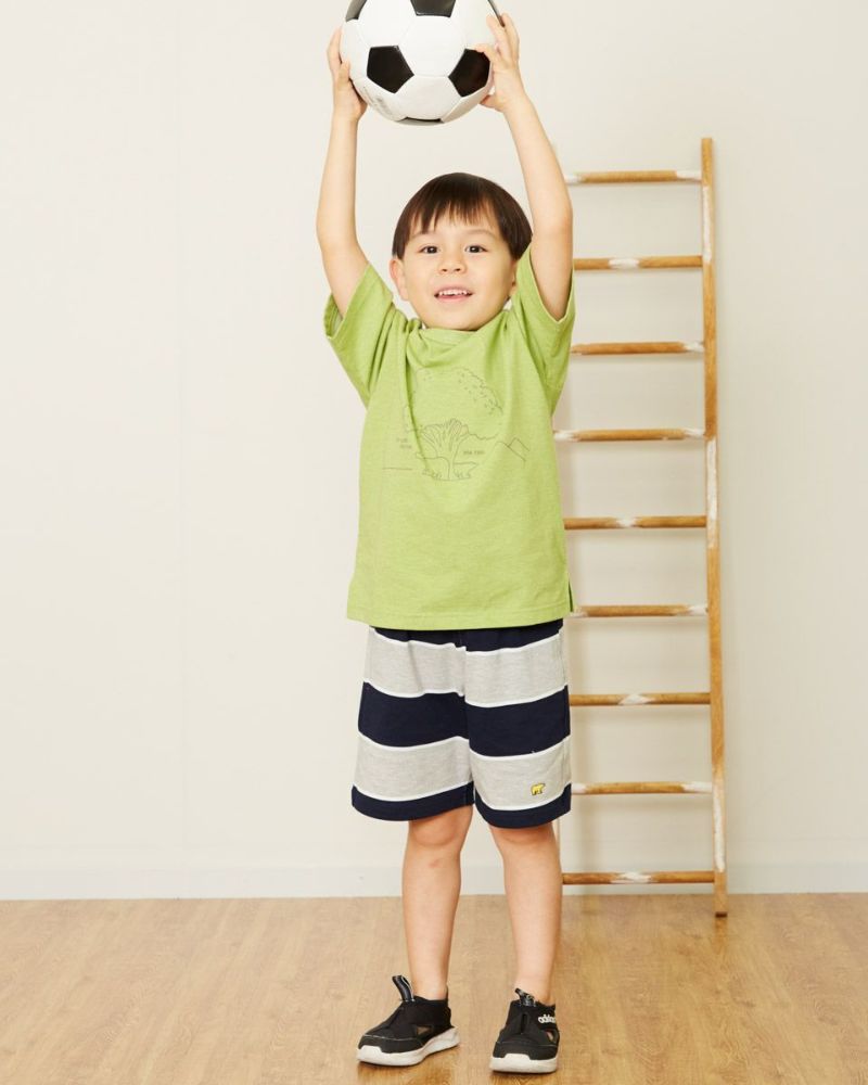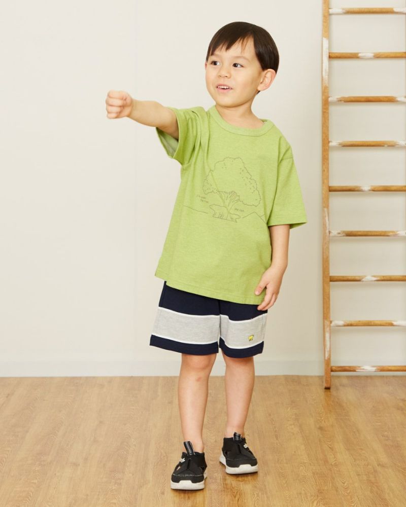 カットソー素材なので動きやすく、元気に遊ぶお子様の強い味方です。お洗濯物も乾きやすいのが嬉しいポイント。 普段使いは勿論、スポーツ観戦時に着ても素敵ですね! 男の子、女の子共通でご利用頂けます。202Q3433のワンピースも同素材を使用しているので、是非兄妹・お父さんとの家族コーディネートもお楽しみ下さい!
