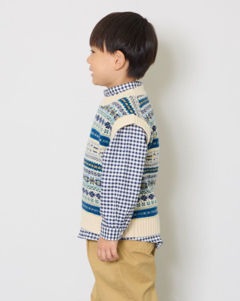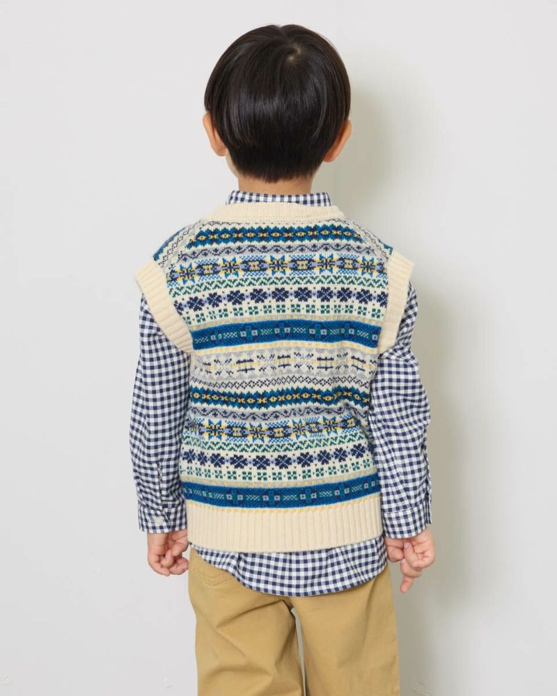 どこか懐かしく温かみのあるフェアアイル柄のニットベストです。 シャツやカットソーとのレイヤードで、寒い季節のコートインにもちょうどいいアイテムです。 ファミリー企画としておそろいの素材感で展開しています。 ボーイズモデル身長: 108 cm 着用サイズ: 110 サイズ ニット (Kids) 同素材のレディースはこちら 同素材のメンズはこちら 家族コーディネートアイテムはこちら