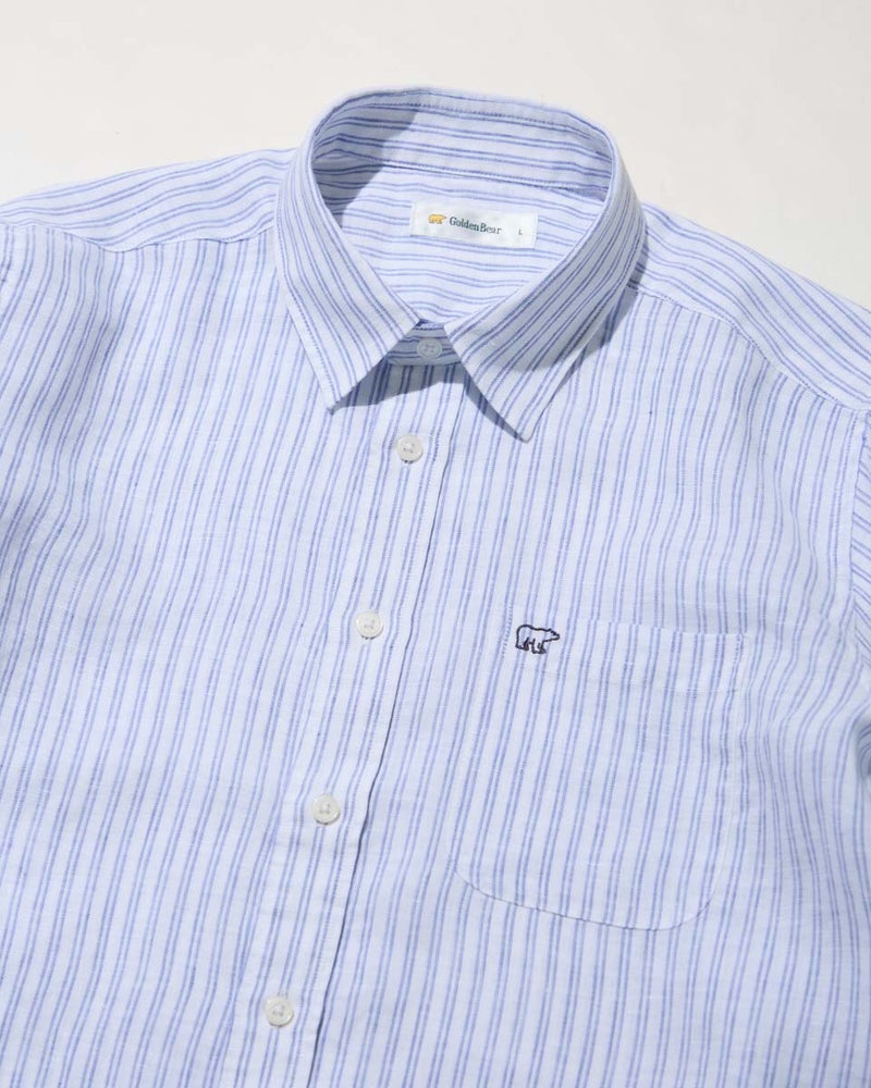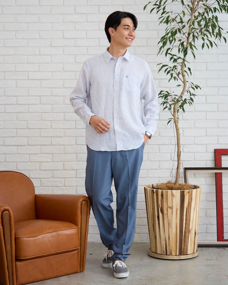 上質なフレンチリネンを100%使用し、特有の清涼感と柔らかな肌触りを存分に引き出したストライプシャツです。リネン素材ながら、イージーケア加工を施すことでシワになりにくく、ノーアイロンでも端正に着用できる高い実用性を備えました。顔映りの良いクリアな色合いと、コーディネートを選ばないバランスの良いストライプ幅が、日常のスタイルに清潔感あふれる彩りを添えてくれます。裾のラインや着丈を絶妙に調整することで、ボトムスにインしてもアウトにしても収まりが良く、綺麗めからカジュアルまで幅広いシーンで活躍する汎用性の高い一枚に仕上げました。シルエットは適度なゆとりを持たせたレギュラーフィット。デニムやスラックスにさらりと合わせるだけで、リネン本来のナチュラルな風合いが際立つ、洗練された大人のトラッドスタイルを叶えてくれます。