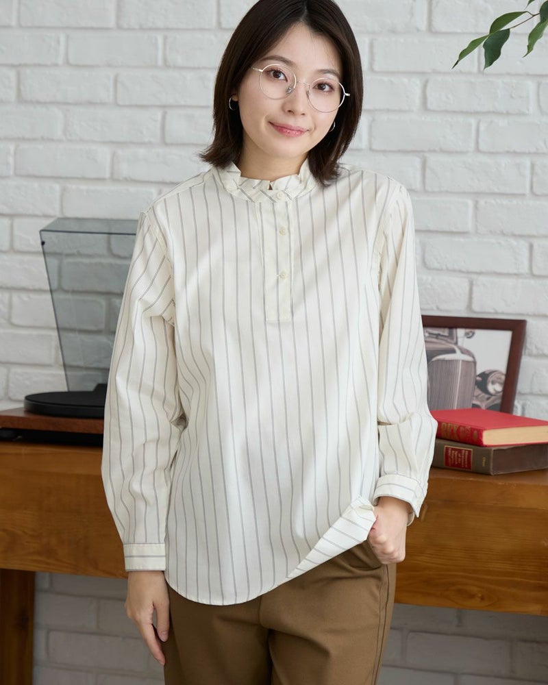 目の詰まったカジュアル過ぎない素材を使用したプルオーバーブラウスです。ひねりの効いたスタンドカラーがすっきりとクリーンな印象です。1枚でシンプルに着用してもサマになる1枚です。 モデル身長: 162 cm 着用サイズ: M サイズ Golden Bear QUEEN SIZE(WOMEN 大きいサイズ ) ブラウス (WOMEN) 同デザイン通常サイズはこちら