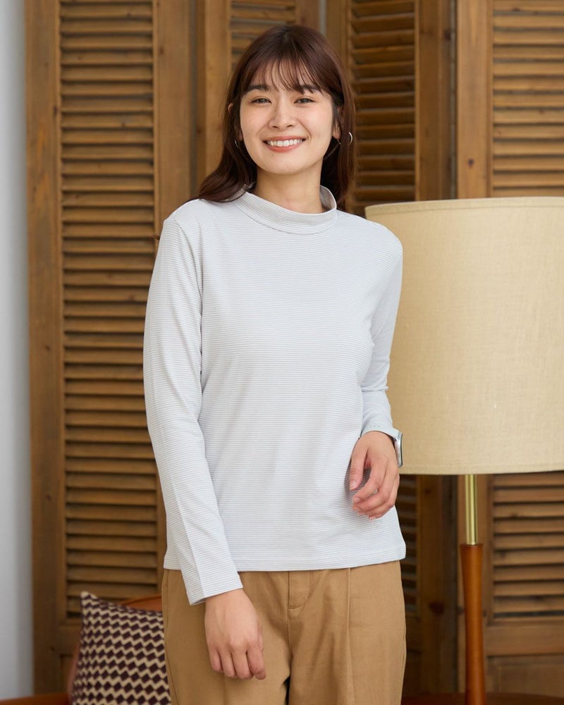 暖かさをキープしてくれるヒート機能付きの、ミジンボーダー柄タートルネック。ピッチの細かいボーダー柄は、遠目には無地のように見える控えめな表情で、幅広いスタイリングに馴染みます。レイヤードのインナーとしても、一枚着としても使える、実用性とさりげないおしゃれ感を兼ね備えたアイテムです。 モデル身長: 168 cm 着用サイズ: M サイズ Golden Bear QUEEN SIZE(WOMEN 大きいサイズ ) カットソー (WOMEN) 同デザイン通常サイズはこちら