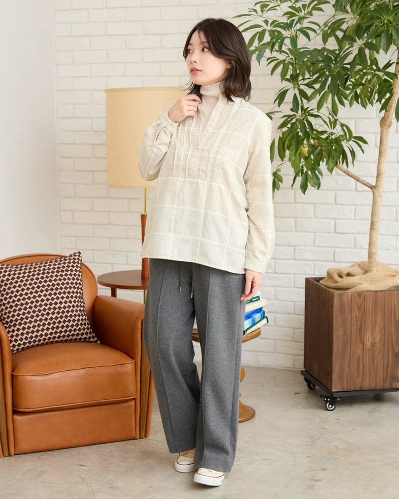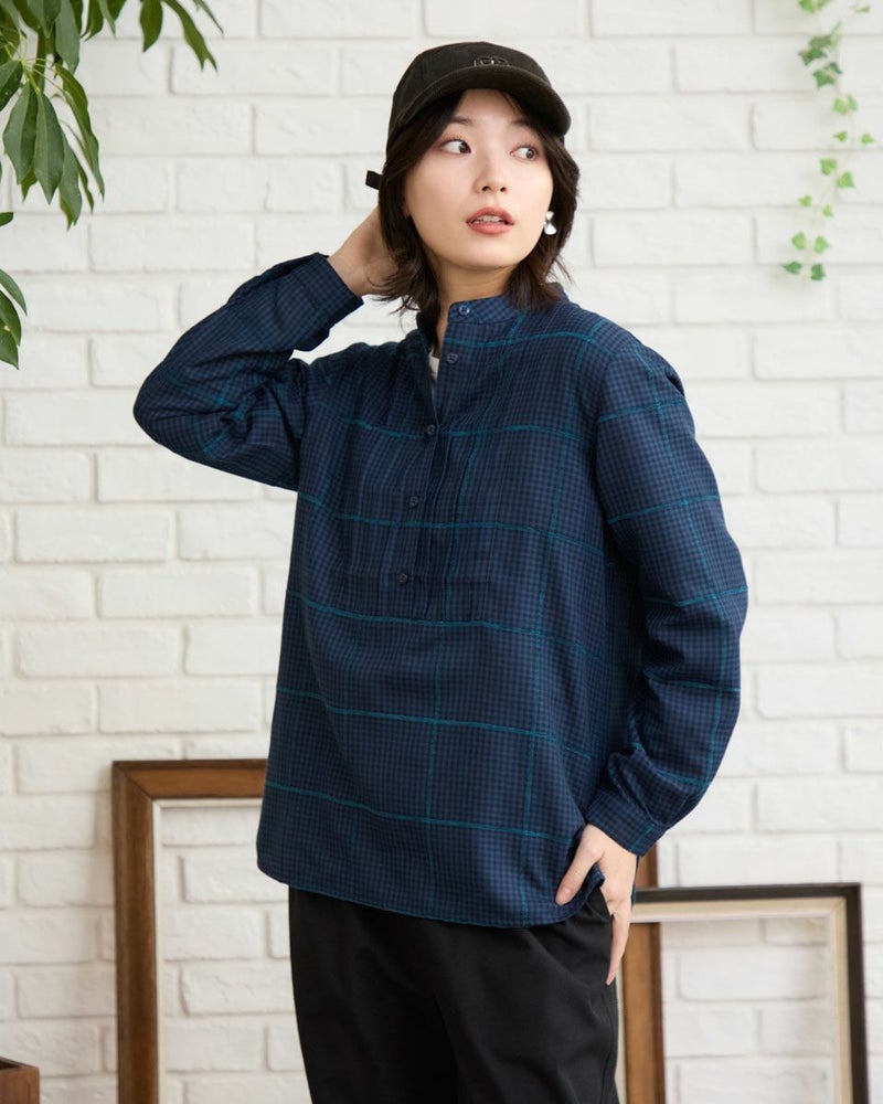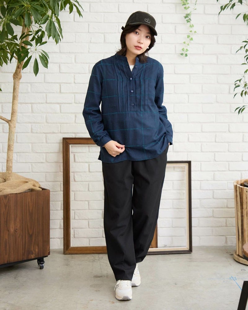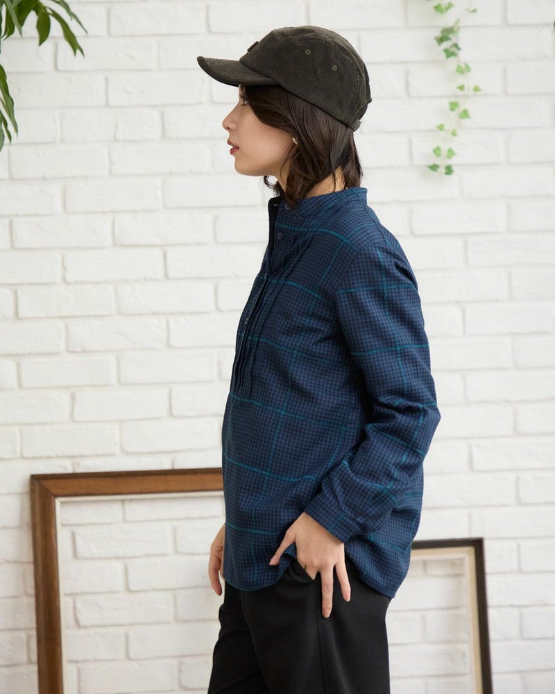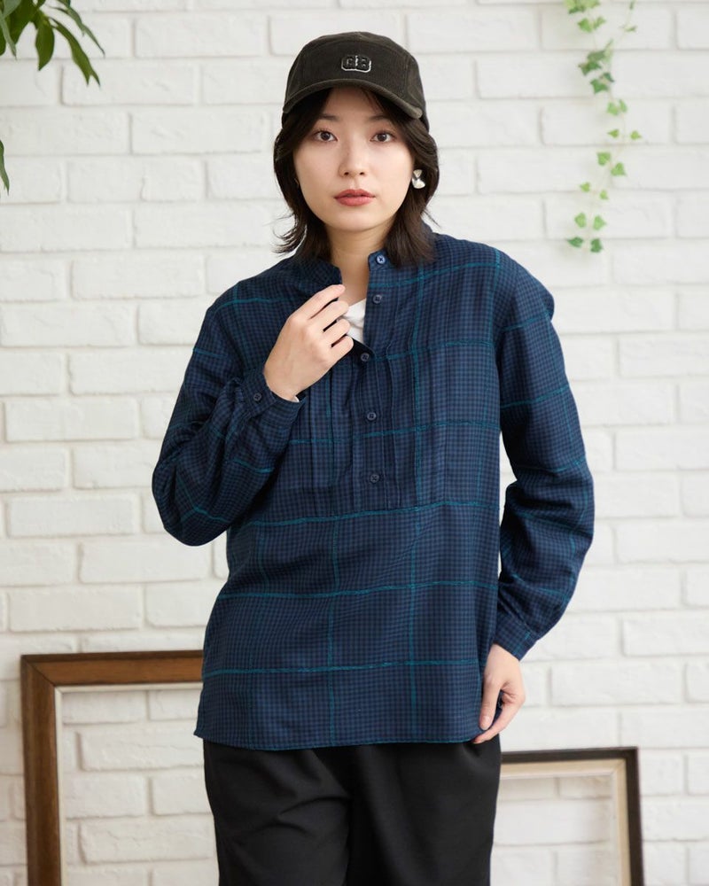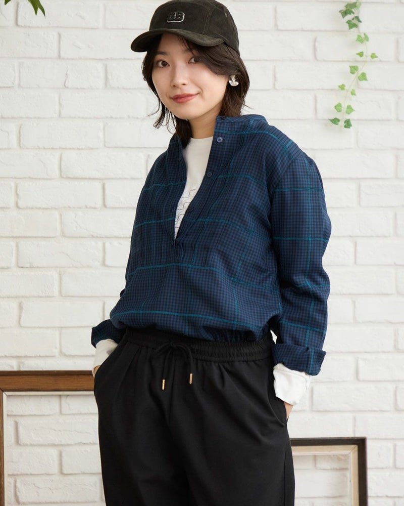モールのチェックラインが印象的なかぶりブラウスです。襟周りのタックがデザインのポイントです。前立てが下まで無いので、ボトムスにインしやすいです。カジュアルからきれいめまで幅広いシーンで着用いただけます。 モデル身長: 162 cm 着用サイズ: M サイズ Golden Bear QUEEN SIZE(WOMEN 大きいサイズ ) ブラウス (WOMEN) 同デザイン通常サイズはこちら