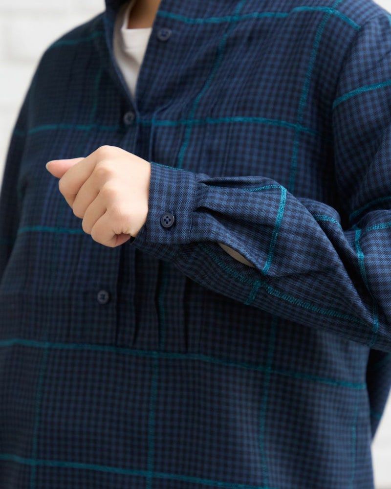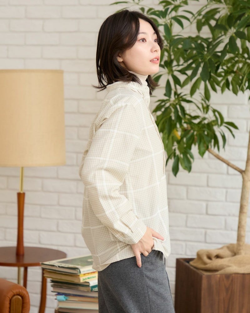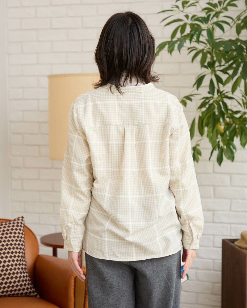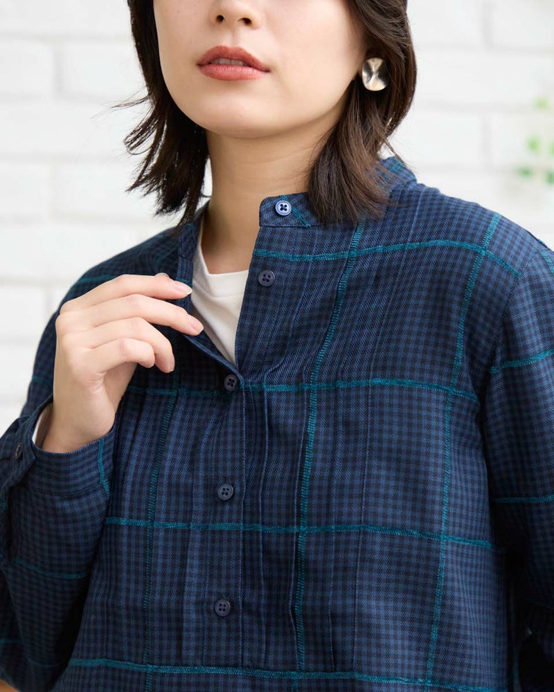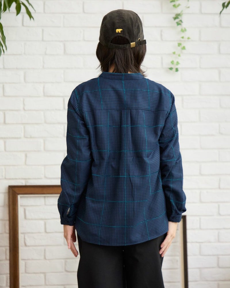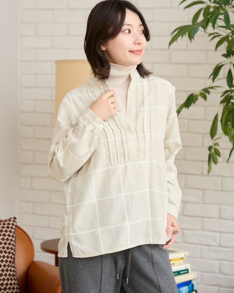 モールのチェックラインが印象的なかぶりブラウスです。襟周りのタックがデザインのポイントです。前立てが下まで無いので、ボトムスにインしやすいです。カジュアルからきれいめまで幅広いシーンで着用いただけます。 モデル身長: 162 cm 着用サイズ: M サイズ Golden Bear QUEEN SIZE(WOMEN 大きいサイズ ) ブラウス (WOMEN) 同デザイン通常サイズはこちら
