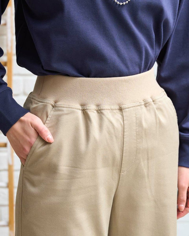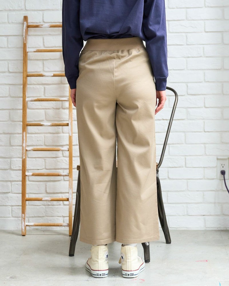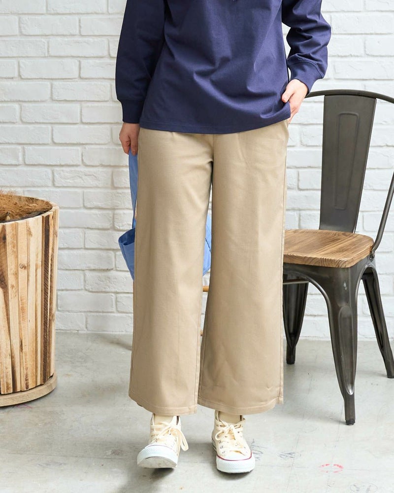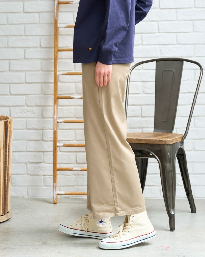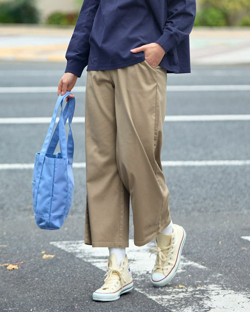 レーヨン・ポリエステル・綿・ポリウレタンのツィルを使用したアンクル丈のセミワイドパンツです。横方向にストレッチが有り、肌触りの柔らかい素材でウエスト部分は身頃と同色系のリブを付け、着用時のお腹への負担を軽減します。色は05ブラックと33ベージュの2色です。 デニム素材はこちら モデル身長: 167 cm 着用サイズ: S サイズ Golden Bear QUEEN SIZE(WOMEN 大きいサイズ ) ボトムス (WOMEN) 同デザイン通常サイズはこちら