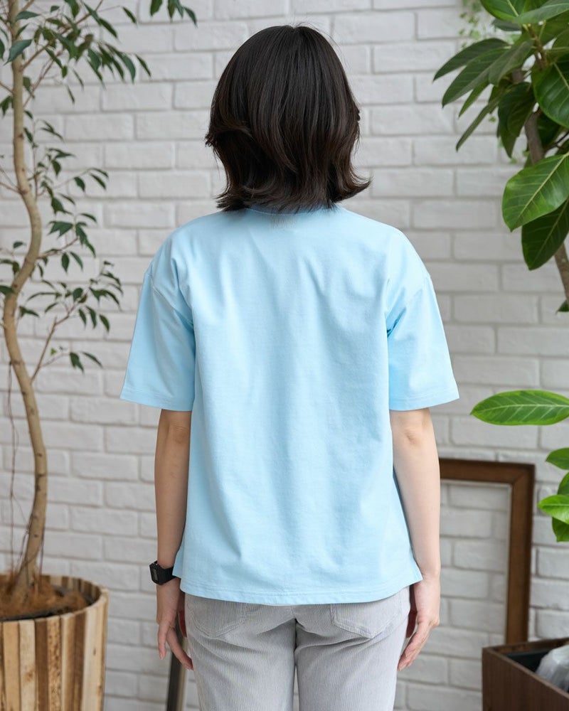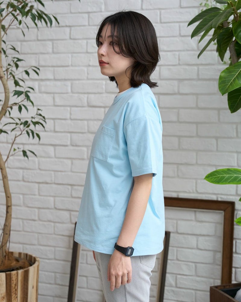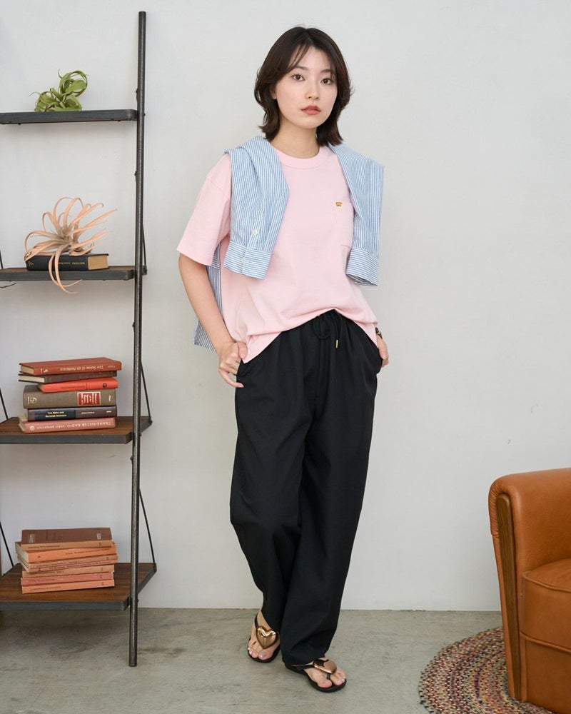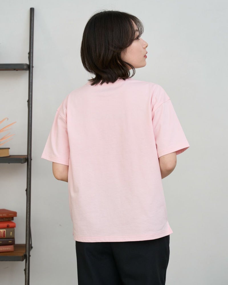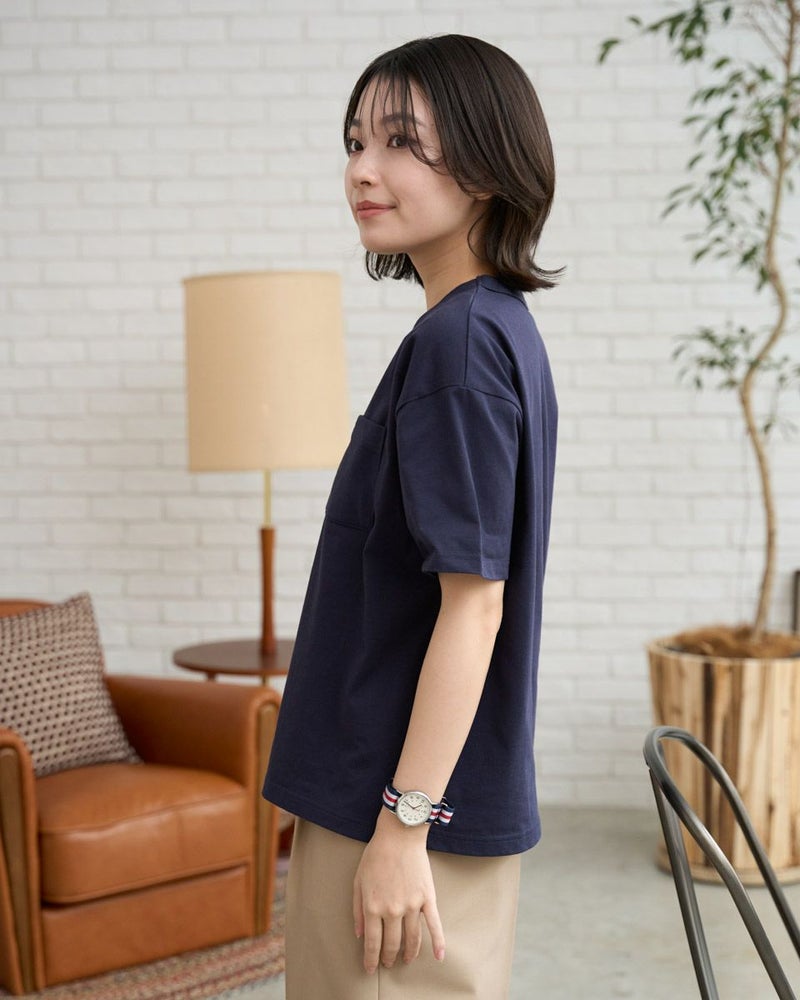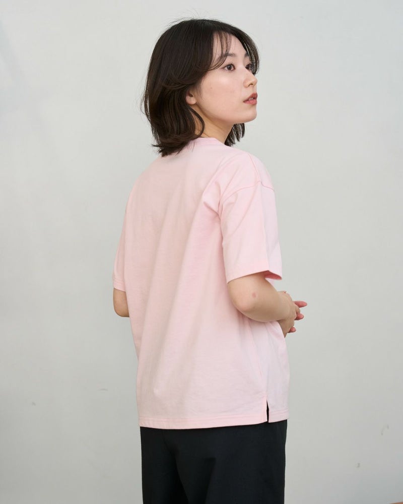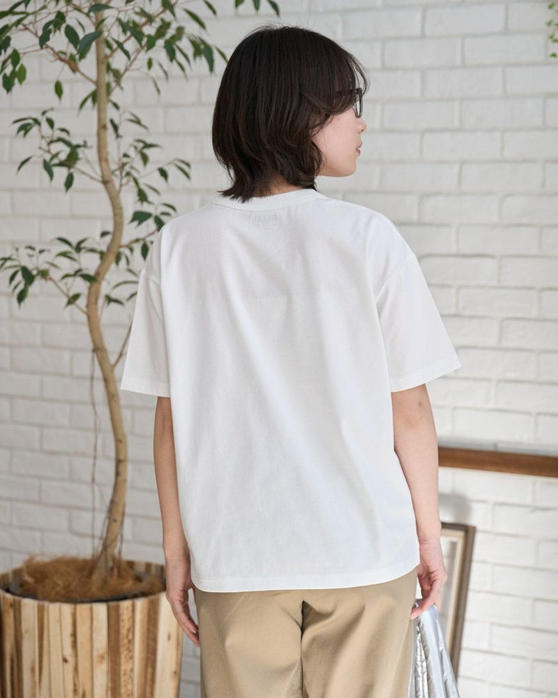 接触冷感・吸水速乾性機能付き。滑らかな肌触りが特長のGB天竺を使用したTシャツです。襟ぐりは強度のあるフライスを使用、バインダー始末にすることでヨレにくいのが特徴です。左胸ポケットにゴールデンベア刺繍付き。ドロップショルダーの五分袖で全体にゆったりとした分量感です。 モデル身長: 162 cm 着用サイズ: M サイズ Golden Bear QUEEN SIZE(WOMEN 大きいサイズ ) カットソー (WOMEN) 同デザイン通常サイズはこちら