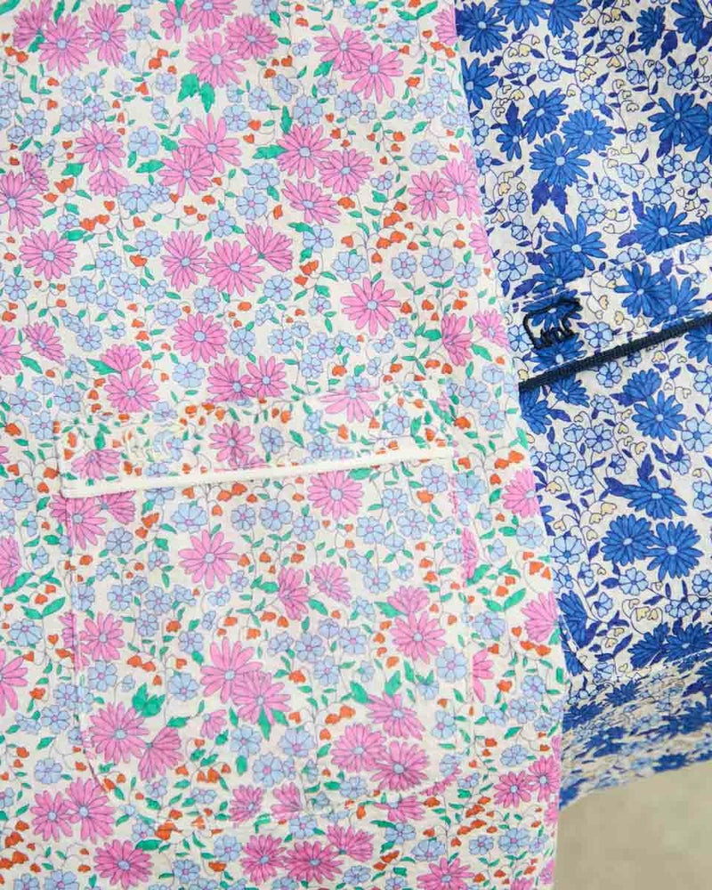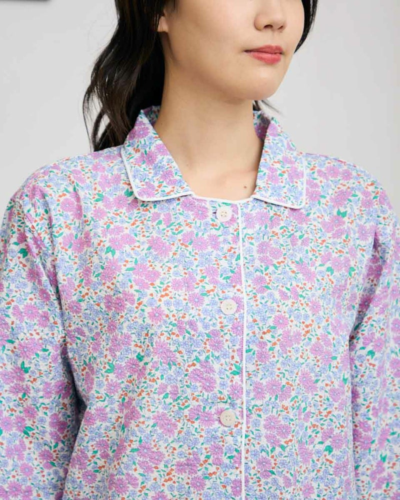 ブルーの花柄プリントとネイビーのトリミングがとても綺麗です。サッカー生地なので軽いしサラサラと肌に付かないのでとても着心地が良いです。色違いも欲しいです。