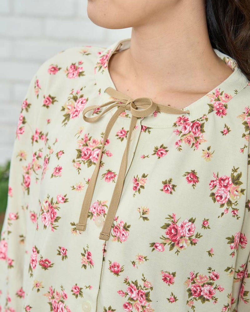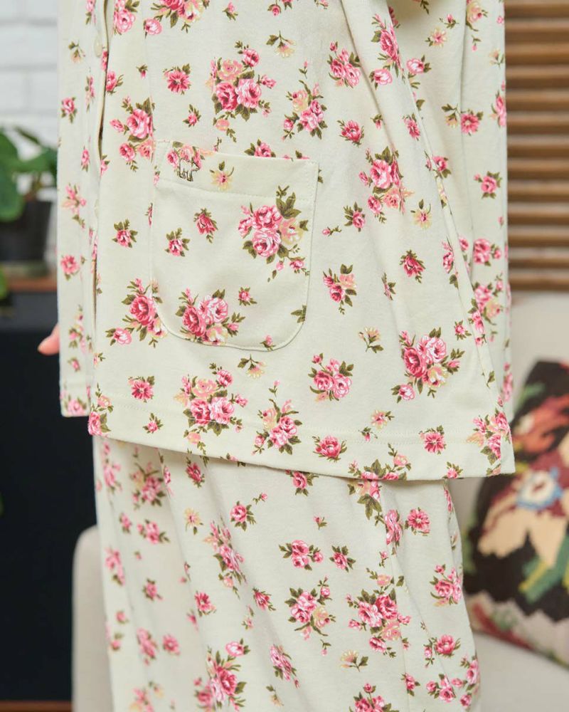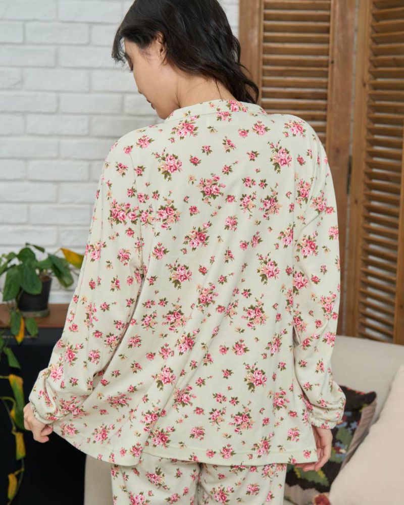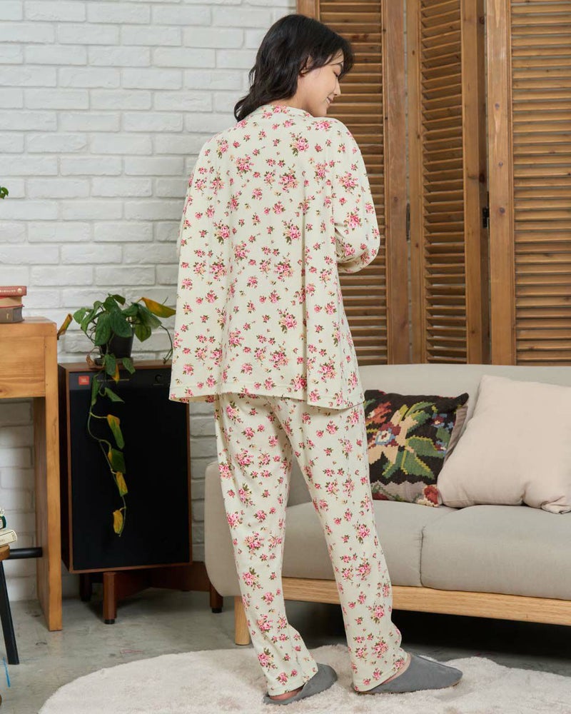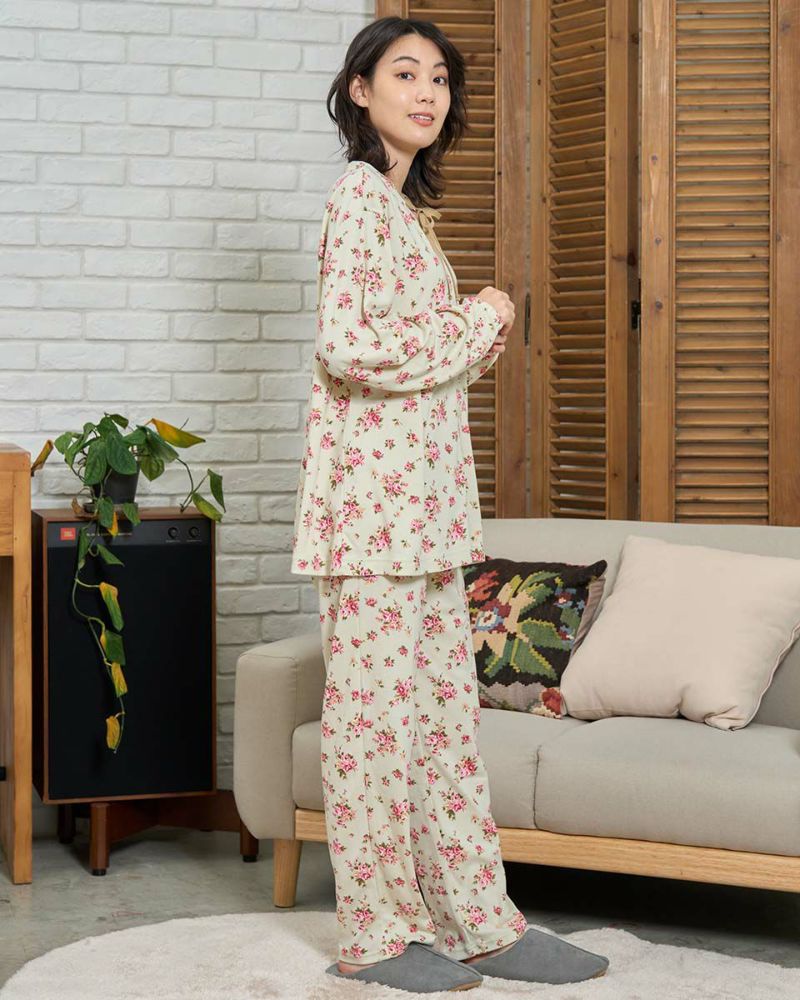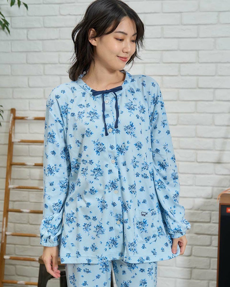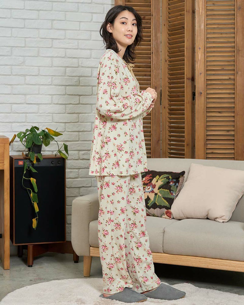 長袖・長ズボンのテーラードカットソーパジャマです。柔らかい肌触りで伸縮性のある生地を使用した小花柄。ゆったりとしたサイズ感で、着心地の良さがおすすめです。