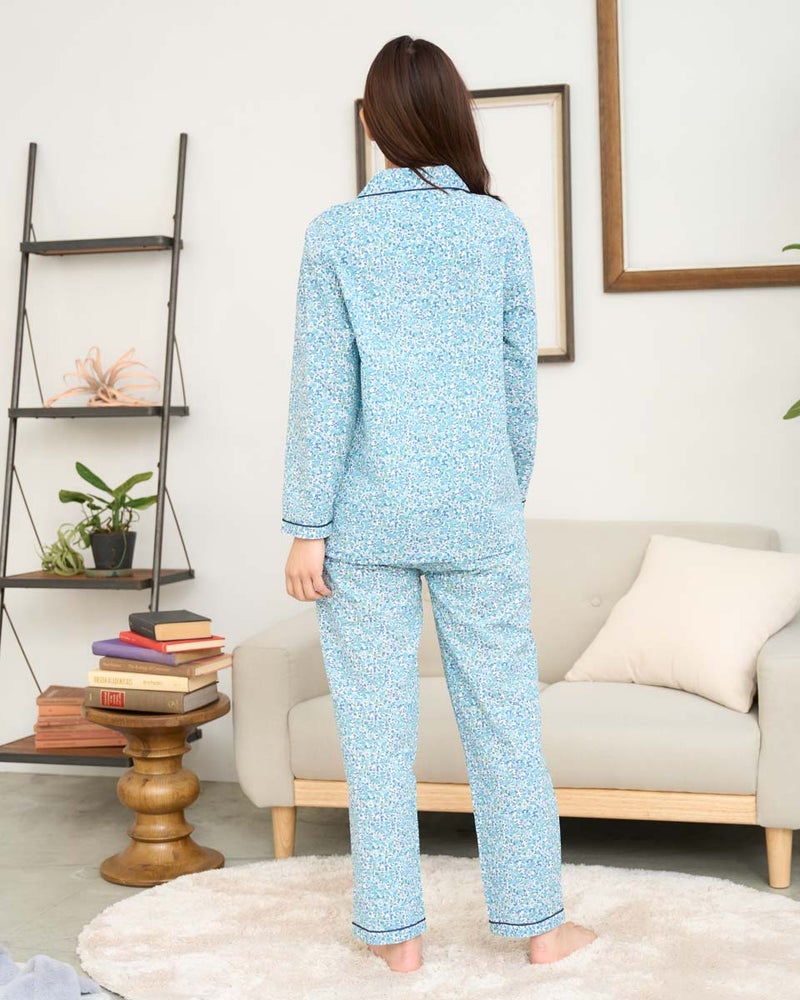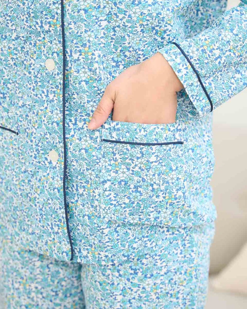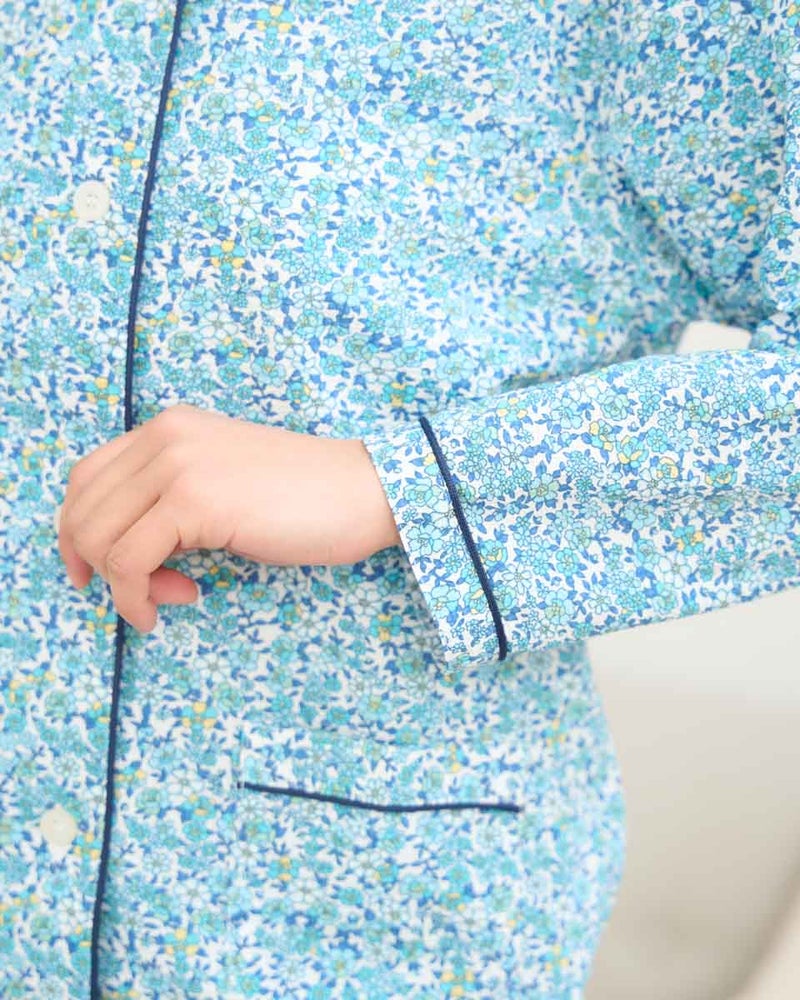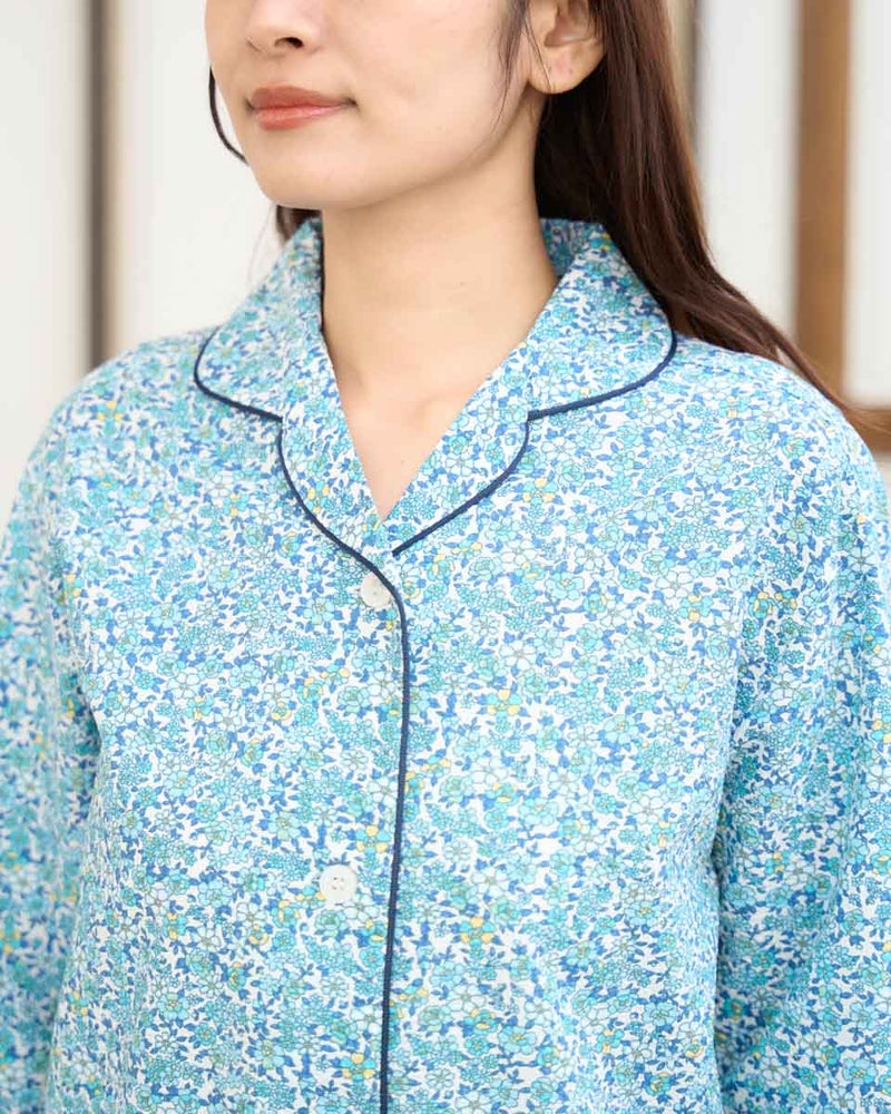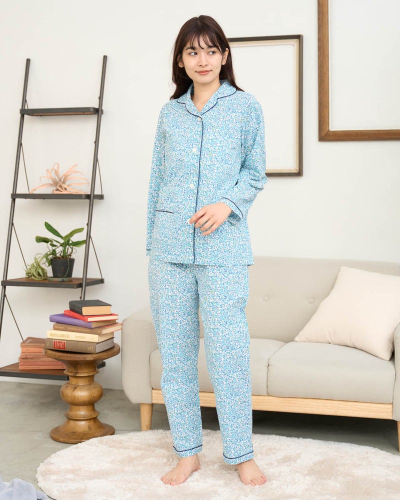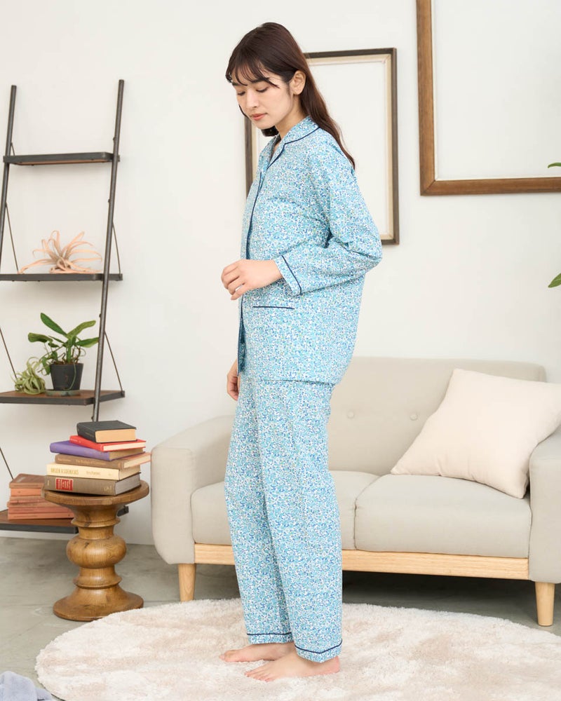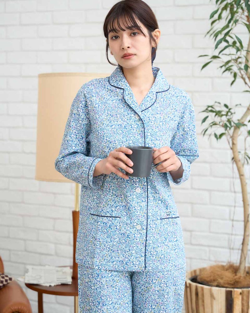 軽く着心地のいい綿100%のリップル素材を使用した、長袖のテーラードパジャマです。表面に凹凸のあるリップル生地は肌離れが良くさらさらとした快適な肌触りで、寝返りやリラックスタイムも快適です。テーラード仕様で首まわりがすっきり見え、上品な印象をあたえつつも、締め付け感が少なくゆったり着用いただけます。さらに、日常使いに便利なポケット付き仕様で、リラックスした時間を過ごすのにうれしい一着です。