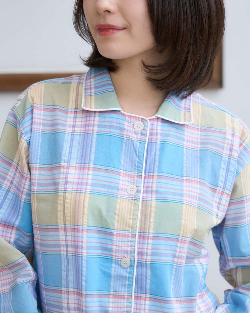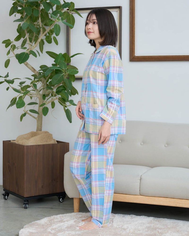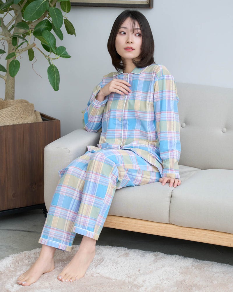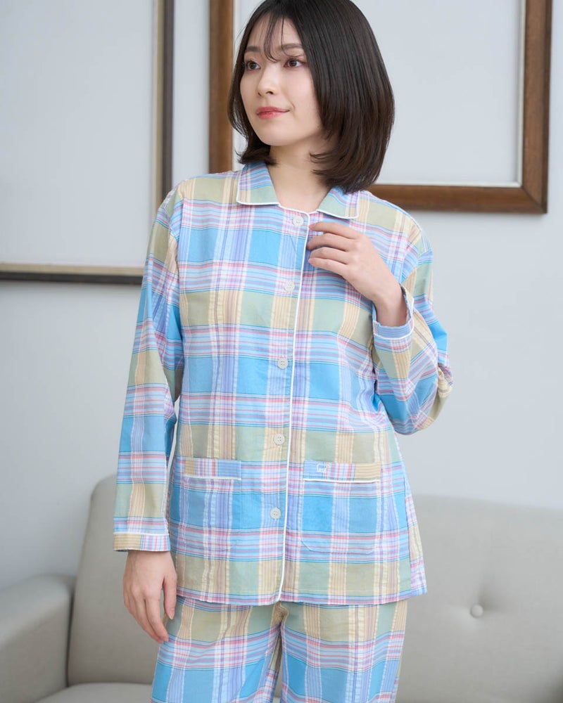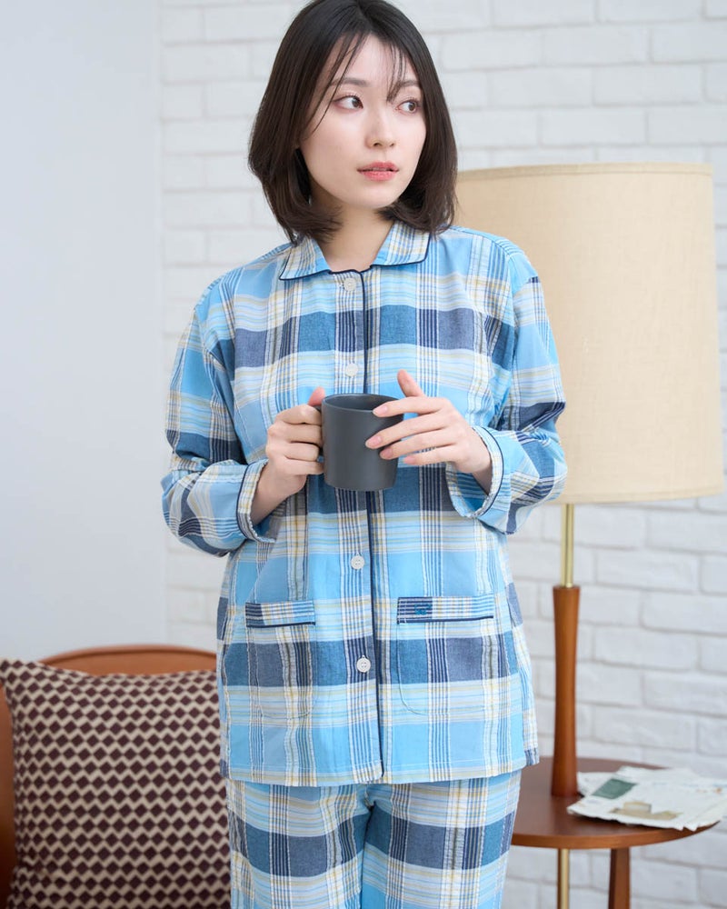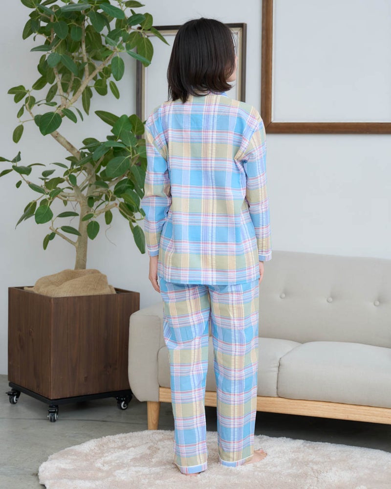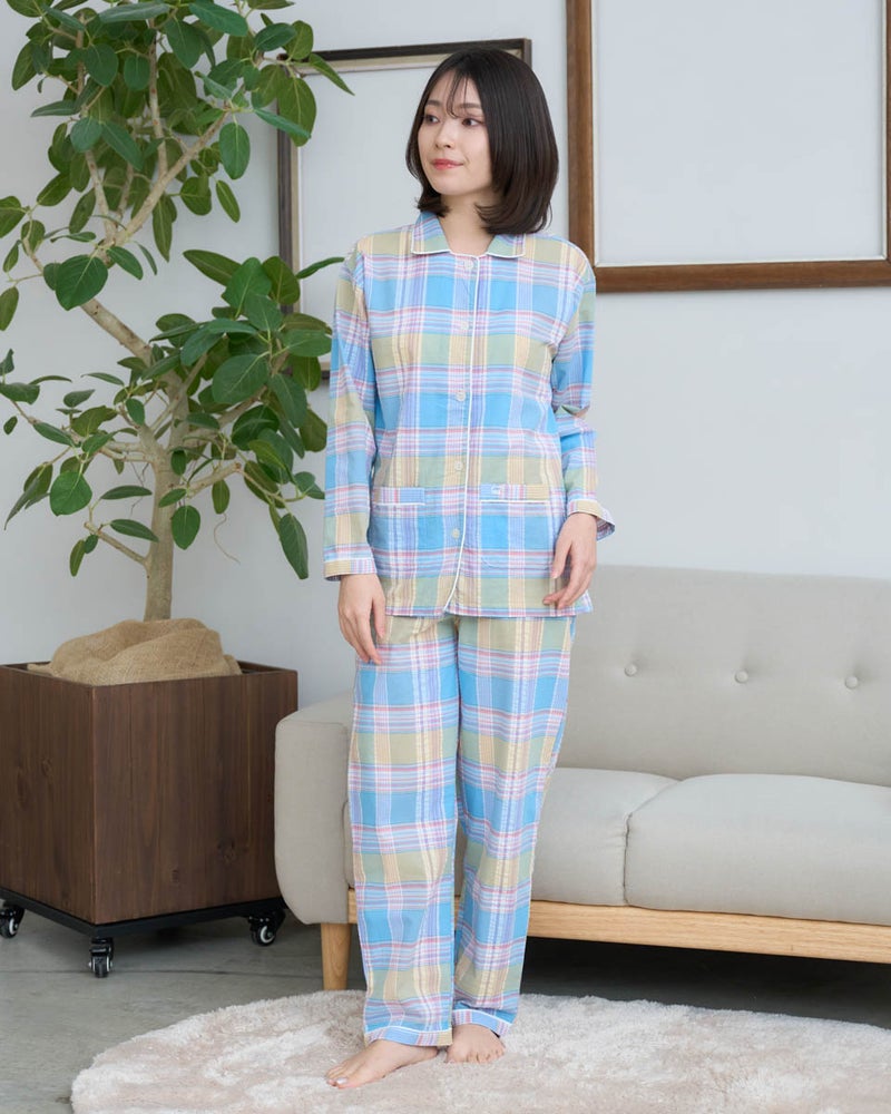 サッカー素材を使用した、長袖・長ズボンのパジャマです。サッカー特有の凹凸は肌離れがよく、さらっと快適な着心地で、寝返りがスムーズに行えます。トラディショナルなチェック柄は見た目にも涼しげで、春から夏にかけて快適に着用できる一着です。さらに、日常使いに便利なポケット付き仕様で、実用性も兼ね備えています。