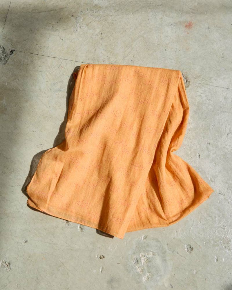 オレンジは、薄く細かく織ったコットンを使っています。サラッと軽やかでベタつかず、家庭洗濯ができるため、寒さ対策だけでなく、ちょっと気温が高い日の日差し除けにもおすすめ。180cmx60cmのサイズ感はしっかり首元を覆い肩や膝を包んでくれます。ぱっと見、無地っぽく見えるプリントは水田に舞う蛍の群れをイメージ。あぜ道の先に広がる幻想的な景色をビビットな点描で表現しました。