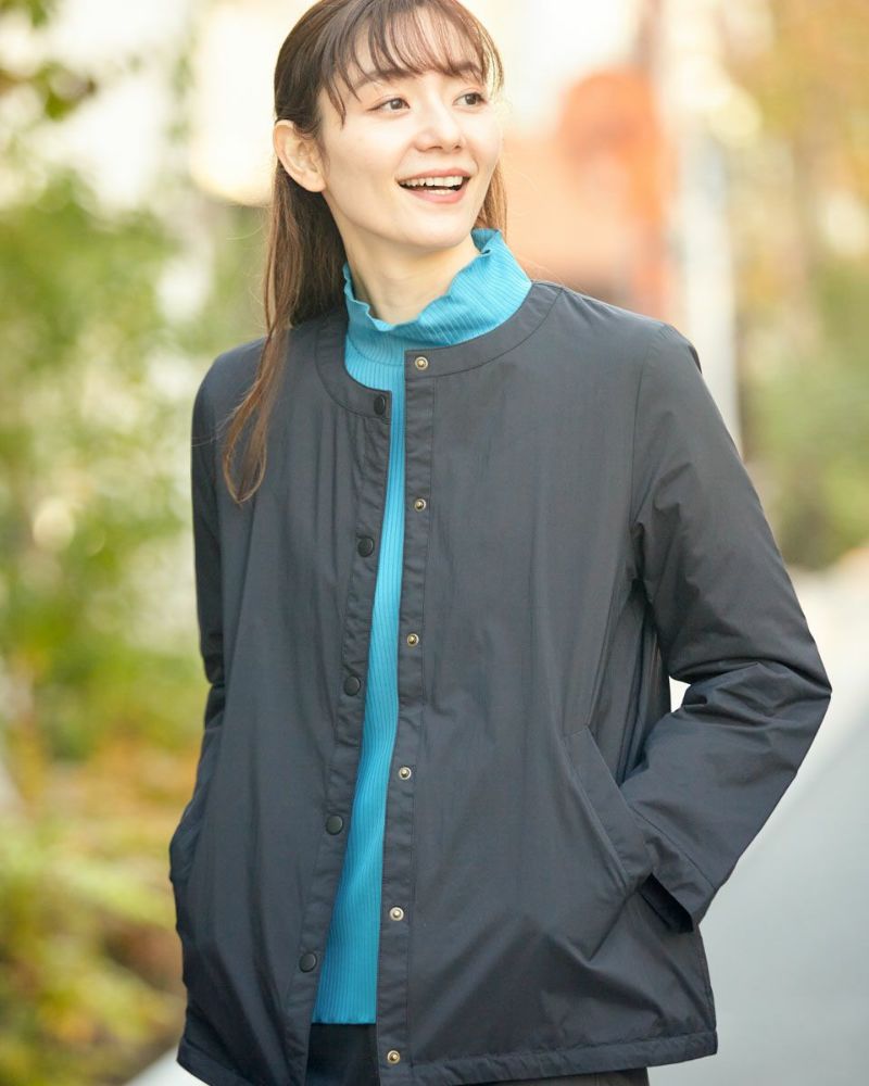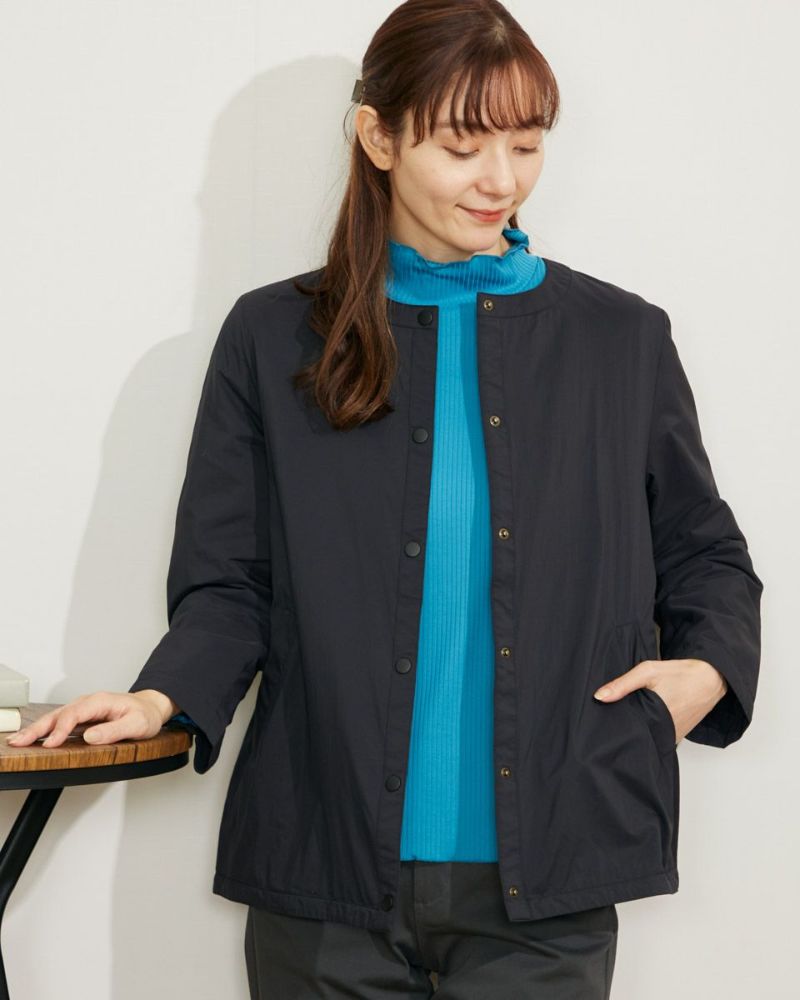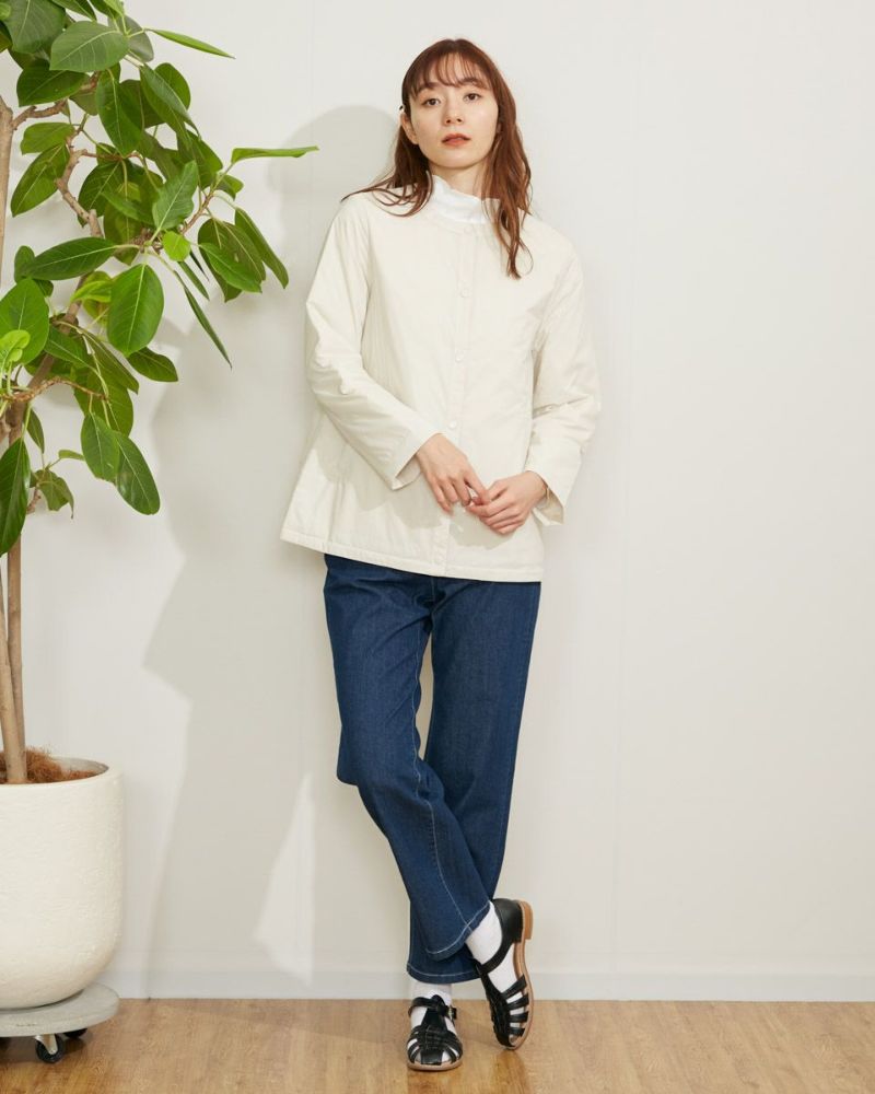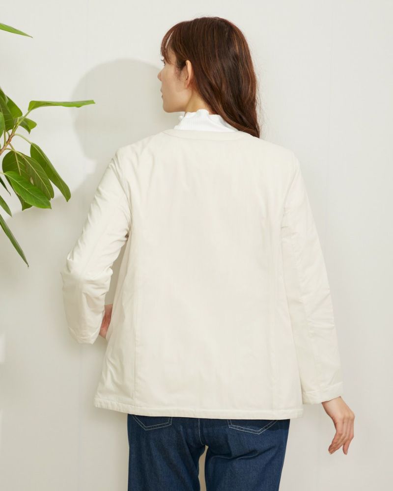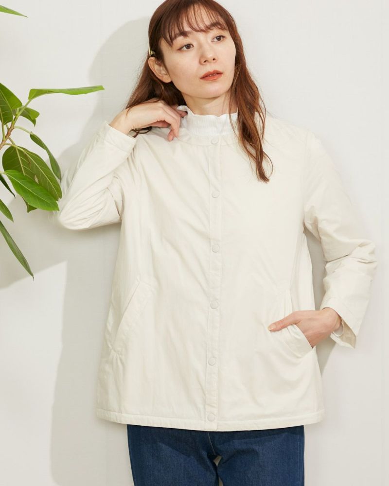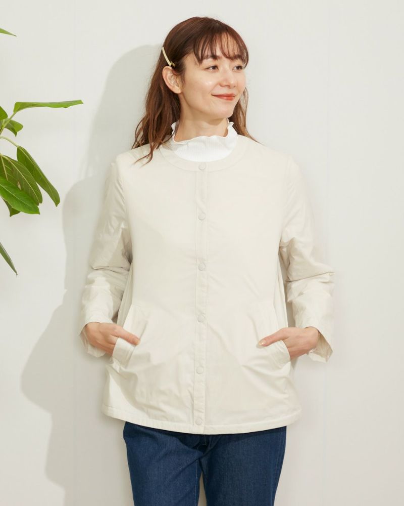 薄くて軽いナイロンの注1)リップストップを使用した中綿ジャケットです。25gの薄い中綿で表にステッチが見えない仕様です。ノーカラーのシンプルなデザインでコートインにも1枚着としても着用いただけます。前中心はドット釦開きで、色はアイボリーとブラックの2色です。注1)リップストップ生地とはコットン・ナイロン・ポリエステル素材に格子状にナイロン繊維を縫い込んだ生地のことです。「裂ける(rip)」ことを「食い止める(stop)」特徴があり、強度のある素材としてアウトドア用品に多く使われています。 モデル身長: 171 cm 着用サイズ: M サイズ 同デザイン大きい(3L,4Lサイズ)はこちら Golden Bear Ladies' アウター (Ladies') 【着用アイテム】467Q1002 帆布トートバッグ 467Q1402 テレコハイネックTシャツ 467Q1703 ストレートパンツ 467Q1701 ブーツカットデニム