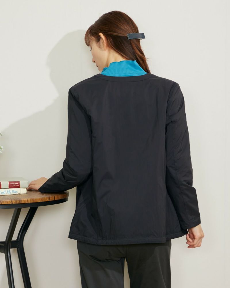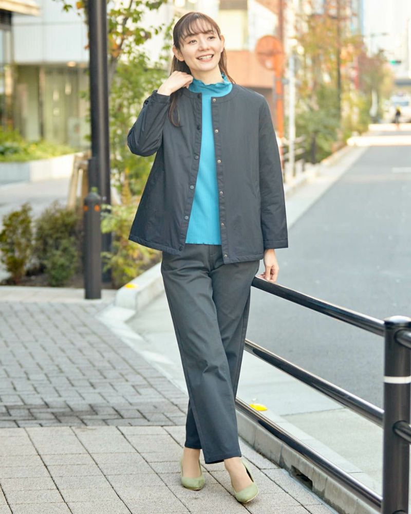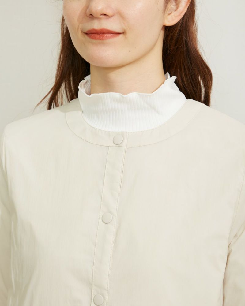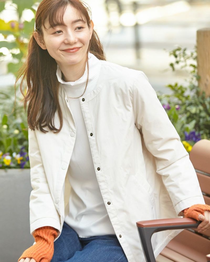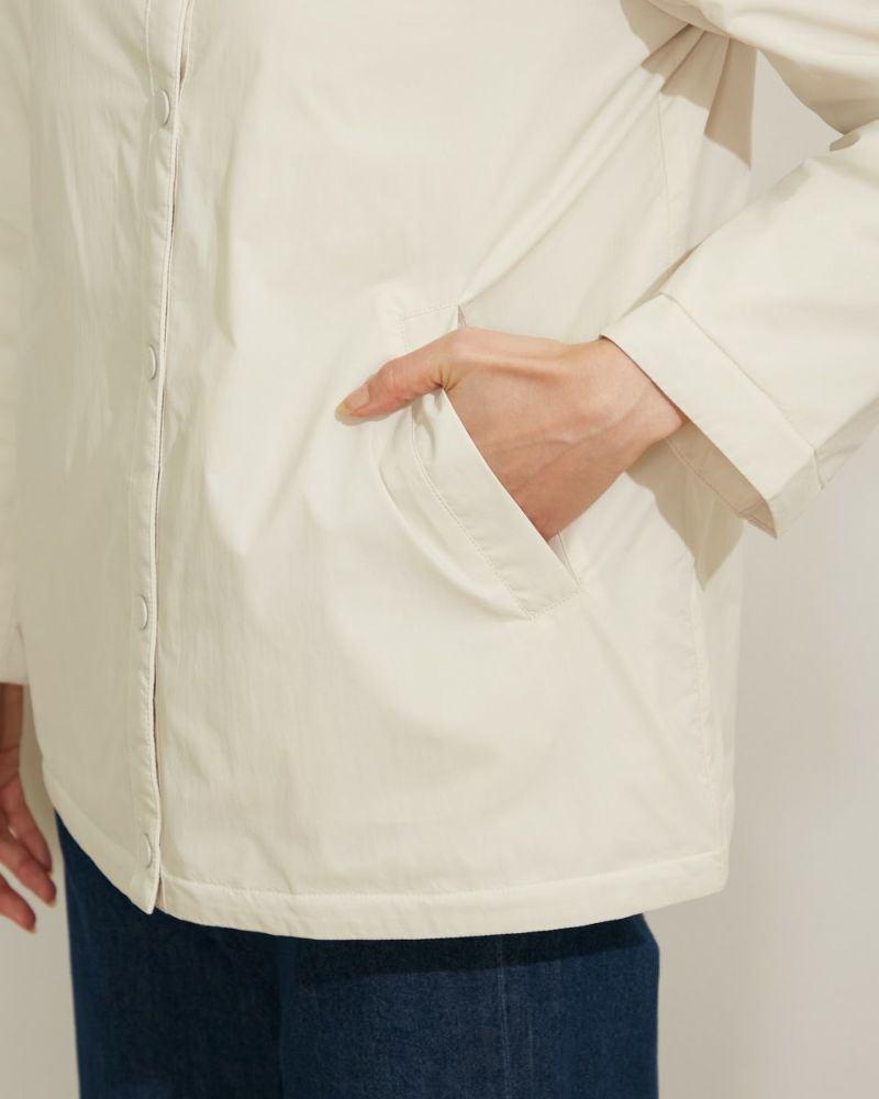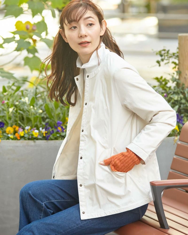 薄くて軽いナイロンの注1)リップストップを使用した中綿ジャケットです。25gの薄い中綿で表にステッチが見えない仕様です。ノーカラーのシンプルなデザインでコートインにも1枚着としても着用いただけます。前中心はドット釦開きで、色はアイボリーとブラックの2色です。注1)リップストップ生地とはコットン・ナイロン・ポリエステル素材に格子状にナイロン繊維を縫い込んだ生地のことです。「裂ける(rip)」ことを「食い止める(stop)」特徴があり、強度のある素材としてアウトドア用品に多く使われています。 モデル身長: 171 cm 着用サイズ: M サイズ 同デザイン大きい(3L,4Lサイズ)はこちら Golden Bear Ladies' アウター (Ladies') 【着用アイテム】467Q1002 帆布トートバッグ 467Q1402 テレコハイネックTシャツ 467Q1703 ストレートパンツ 467Q1701 ブーツカットデニム