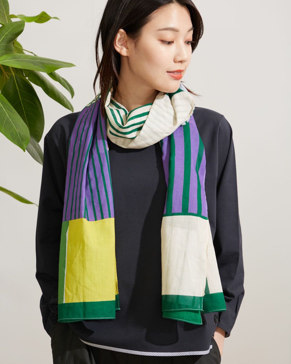 クラシックな幾何学模様のプリントストールです。肌触りの良い綿素材を使用しています。 モデル身長: 166 cm 着用サイズ: M サイズ Golden Bear WOMEN アクセサリ (WOMEN) 【着用アイテム】467Q3312 刺しゅうブラウス 468Q3456 クルーネックカットソー