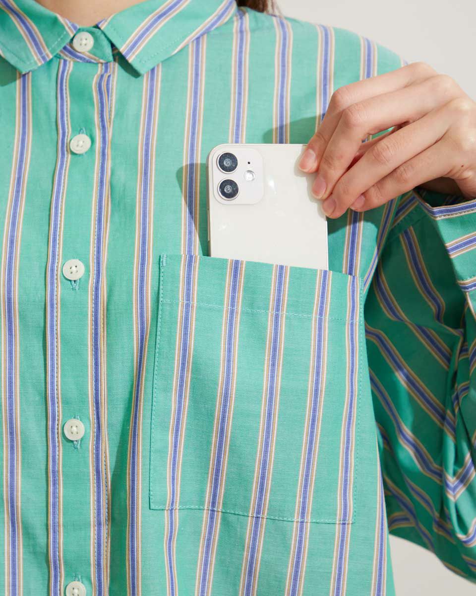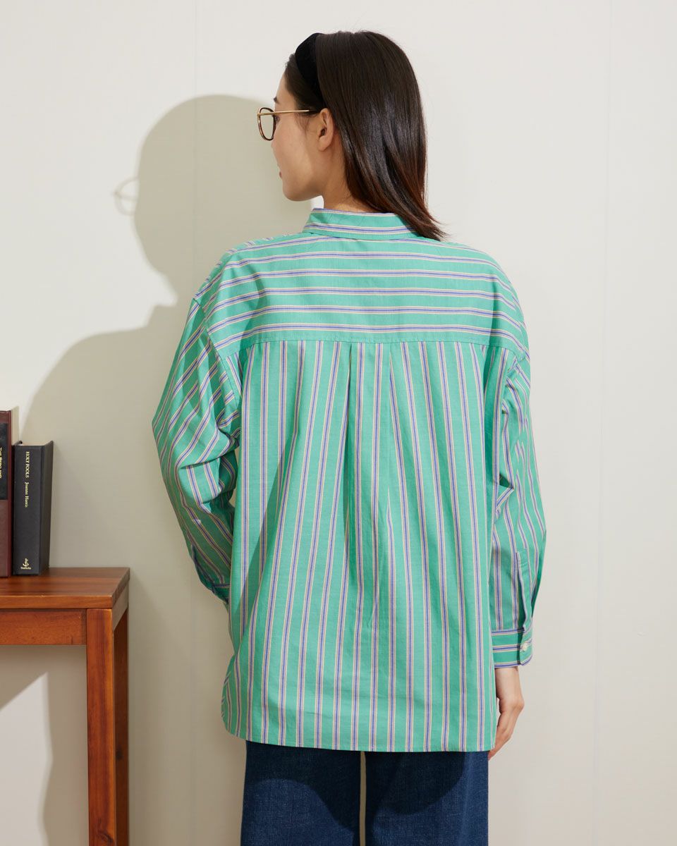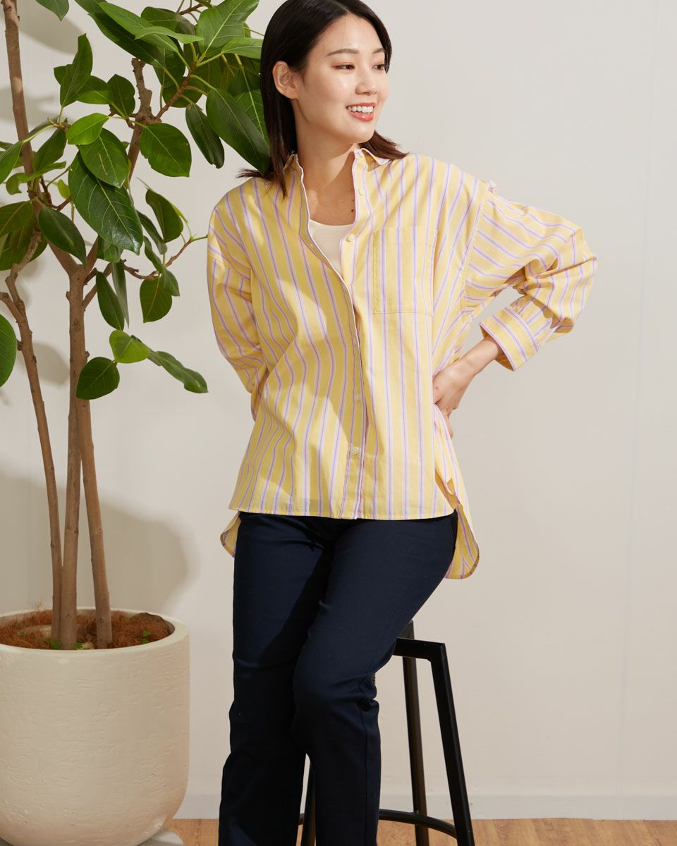 気分を高めてくれるカラーリングのストライプシャツです。定番シャツをベースに、身頃にゆとりを持たせアウトにしてもバランスよく着こなせる着丈感です。1枚で着映えするおすすめアイテムです。 モデル身長: 166 cm 着用サイズ: M サイズ Golden Bear WOMEN ブラウス (WOMEN) 【着用アイテム】467Q3405 タンクトップ 467Q3701 ワイドデニム 467Q3703 テーパードパンツ