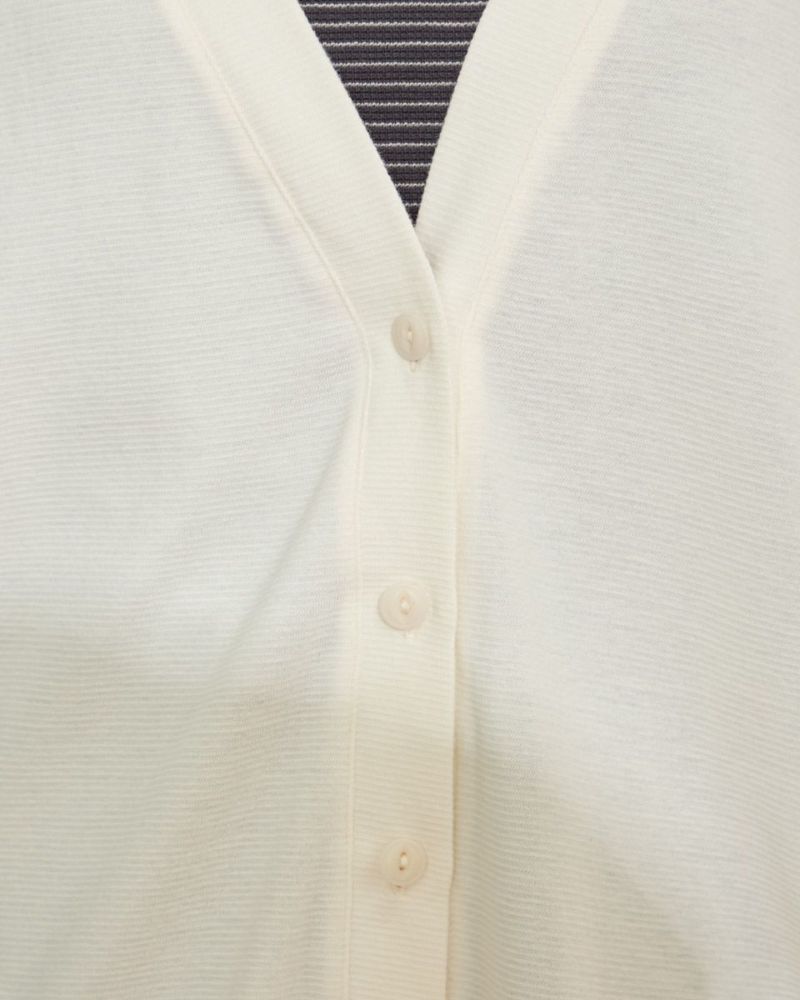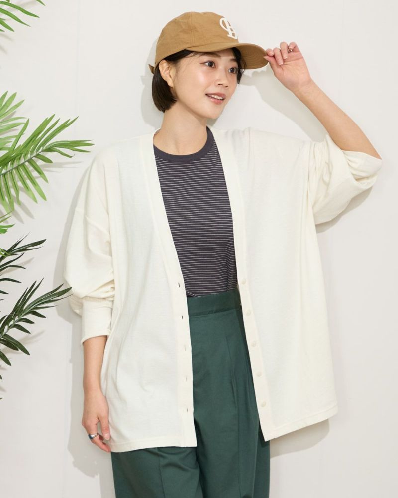 ソフトなタッチのホカケフライスを使用したカットソーのカーディガン。 お手入れが簡単で冷房対策や日除け、汗をかく時期にもお勧めです。コーディネートを邪魔しないオフ白と黒のベーシックな2色展開です。 モデル身長: 167 cm 着用サイズ: M サイズ Golden Bear WOMEN カットソー (WOMEN) 【着用アイテム】467Q4412 ボーダータンクトップ 467Q4712 コードレーンテーパードパンツ 468Q3751 ワイドパンツ