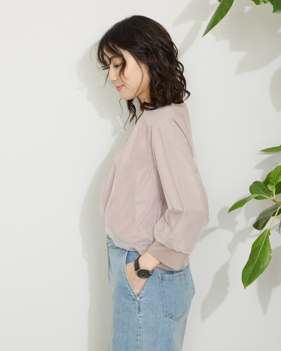 表面が綺麗なプレーティング天竺を使用したデザイントップス。身頃と袖にソフトチュールを重ねてシンプルですが印象的な雰囲気に仕上げました。デニムなどと合わせてもカジュアルになりすぎないのがポイントです。 モデル身長: 166 cm 着用サイズ: M サイズ Golden Bear WOMEN カットソー (WOMEN) 【着用アイテム】467QA701 デニムスカート 467QA711 セミワイドパンツ