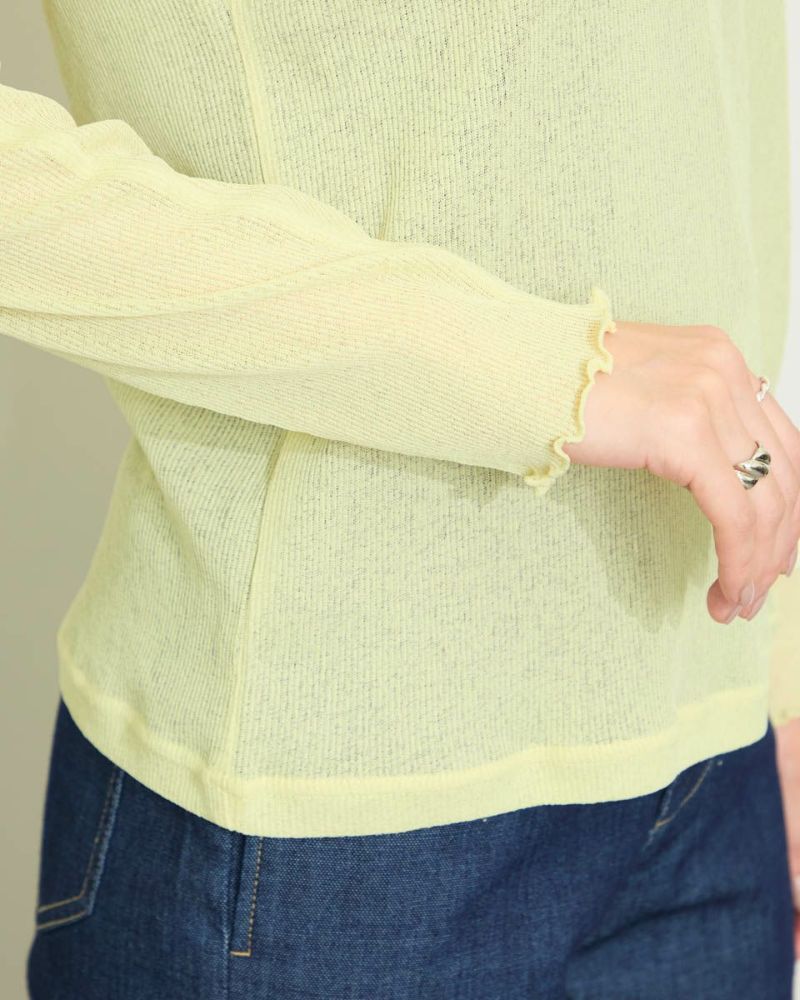 透け感のあるスラブテレコを使用したトップスです。シャリ感があるので肌離れが良く、季節の変わり目の重ね着に重宝するアイテムです。 モデル身長: 166 cm 着用サイズ: M サイズ Golden Bear Ladies' カットソー (Ladies') 【着用アイテム】467QB701 デニムワイドパンツ 467QB711 スカート