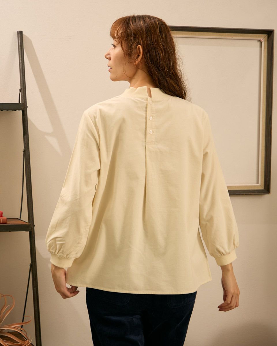 コーデュロイの素材に襟ぐりと袖口にRIBを採用して着ごごちよく仕上げました。カットソー感覚で着用できる1枚です。 モデル身長: 171 cm 着用サイズ: M サイズ Golden Bear WOMEN ブラウス (WOMEN) 【着用アイテム】467QD701 1タックテーパードパンツ 467QD702 折山プレステーパードパンツ 467QD032 キルト帽子