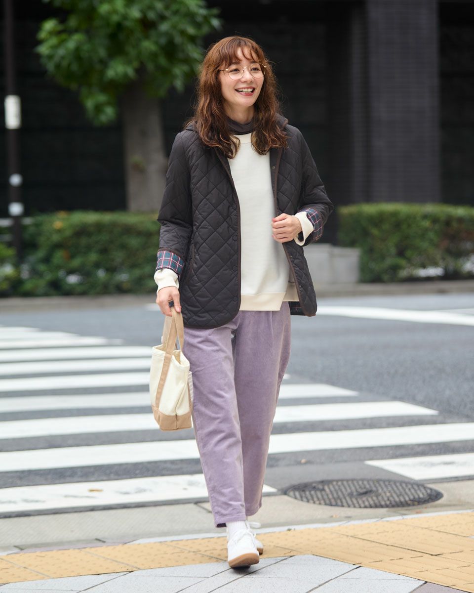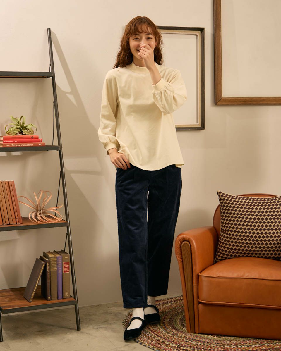 やや畝の目立つ8Wコーデュロイを使用したテーパードパンツです。ウエスト部分は後ろにギャザーを入れ、前はタックを入れていますので、全体にゆとりの有るテーパードシルエットです。前中心ファスナー開きです。 モデル身長: 171 cm 着用サイズ: 61 サイズ Golden Bear WOMEN ボトムス (WOMEN) 【着用アイテム】467QC411 タートルネックTシャツ 467QD301 コーデュロイブラウス 467QD431 ロゴプルオーバー 467QD131 洗えるGBキルトジャケット 467QD032 キルト帽子