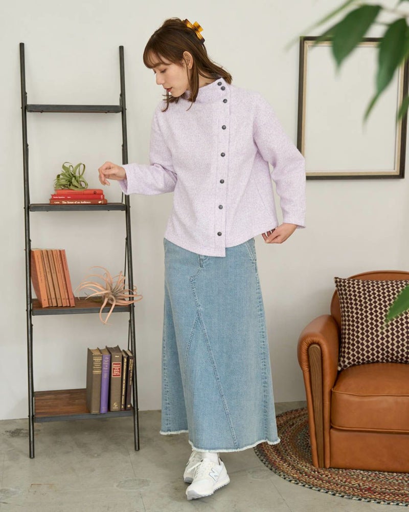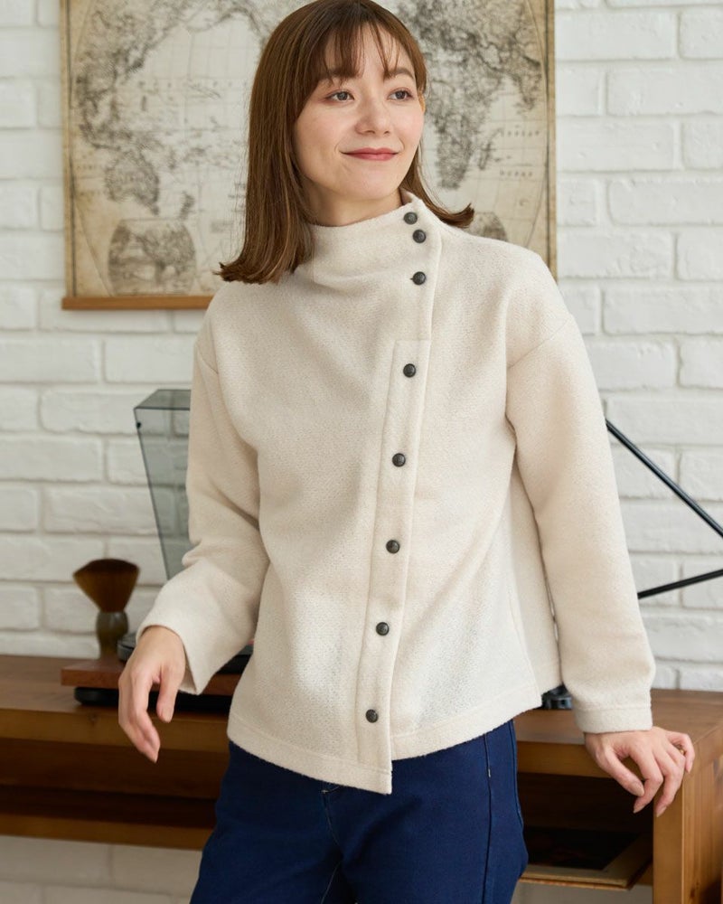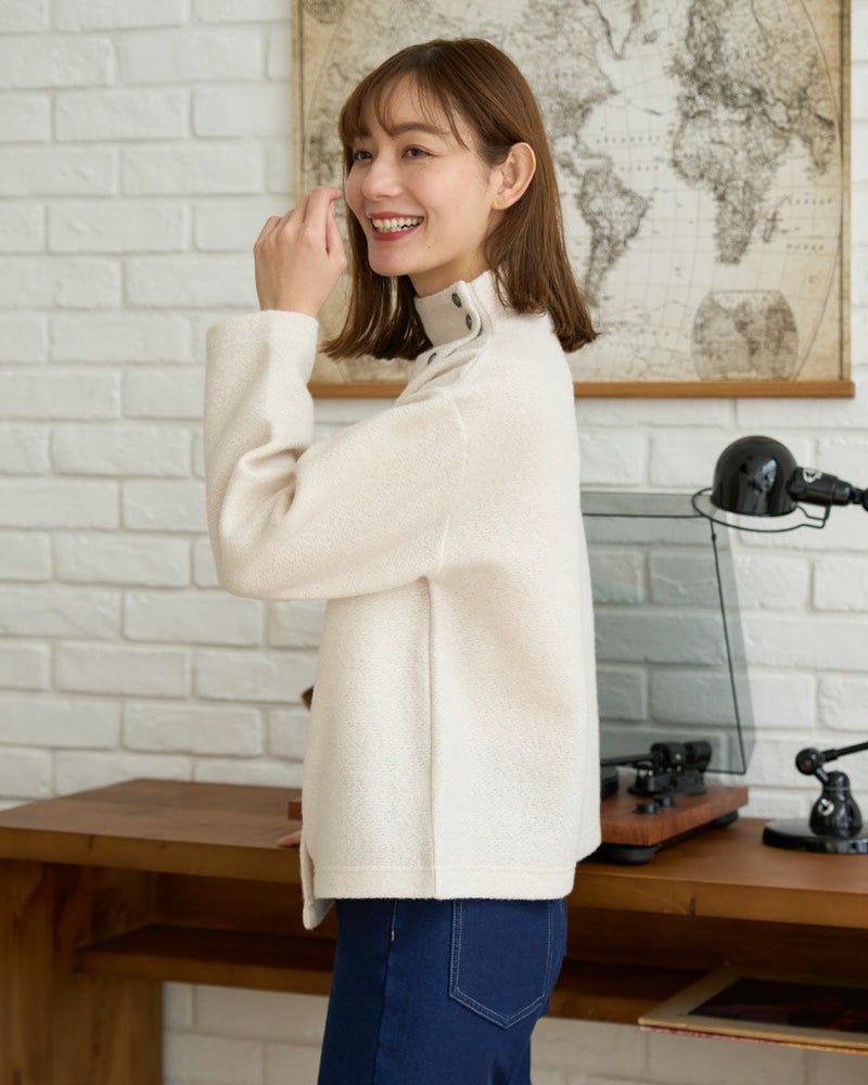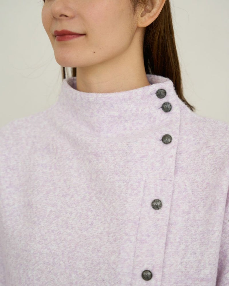 ブークレー調のジャカードを使用したボトルネックのプルオーバー。斜めに切り替えた前身とボタンデザインが印象的な一枚です。 モデル身長: 171 cm 着用サイズ: M サイズ Golden Bear WOMEN カットソー (WOMEN) 【着用アイテム】467QD710 ストレートパンツ