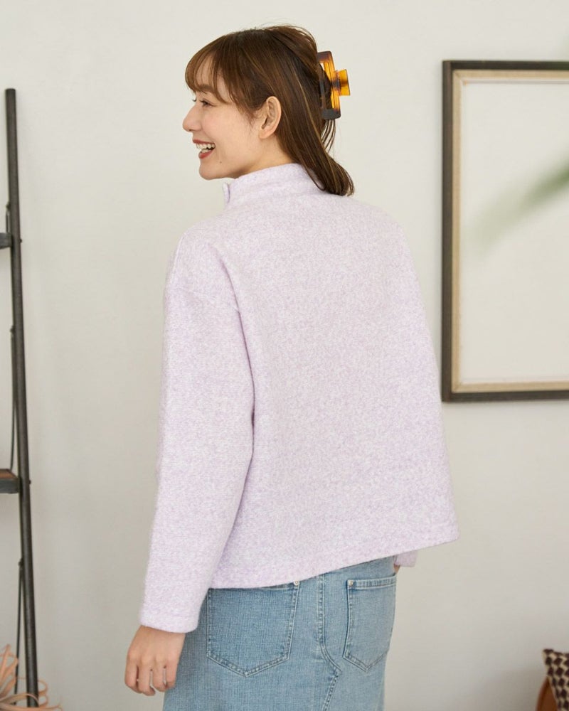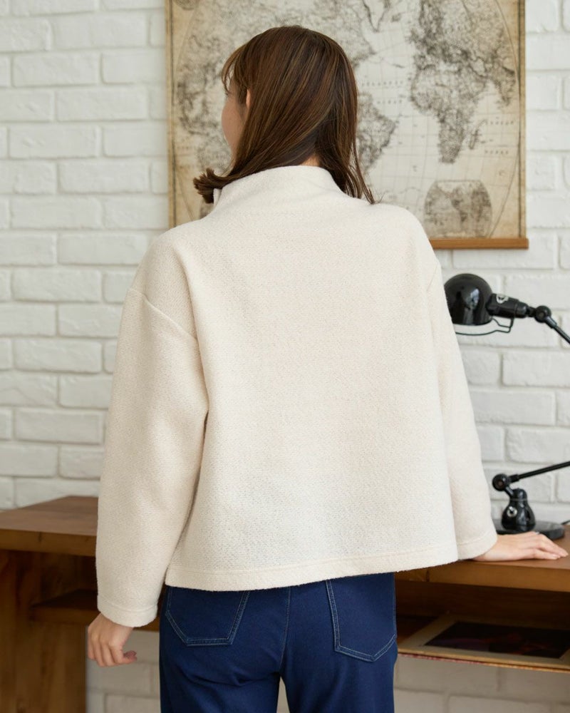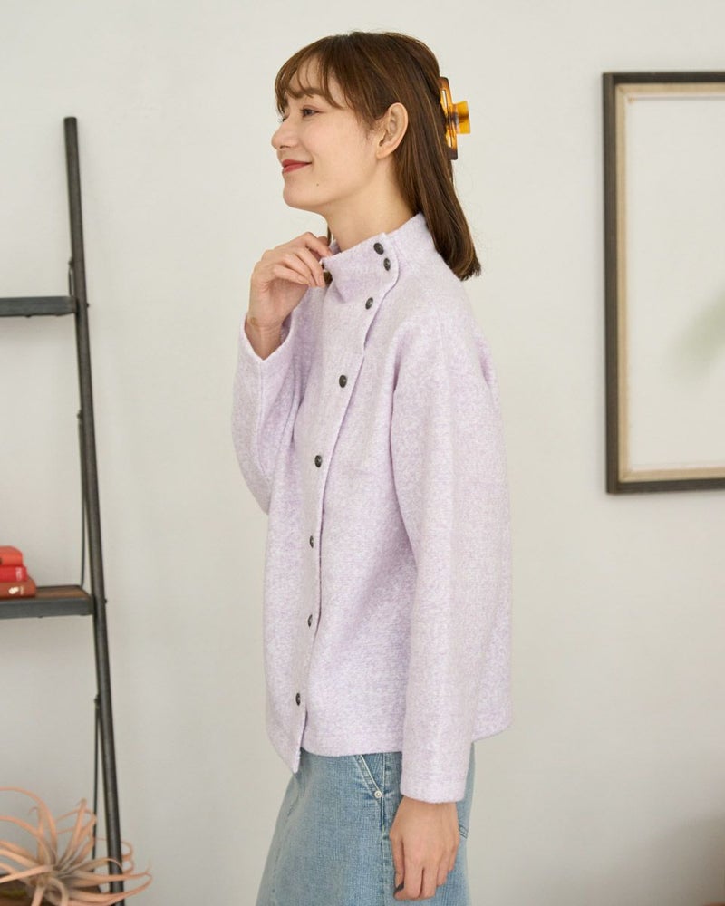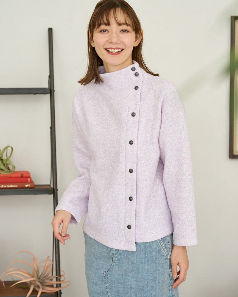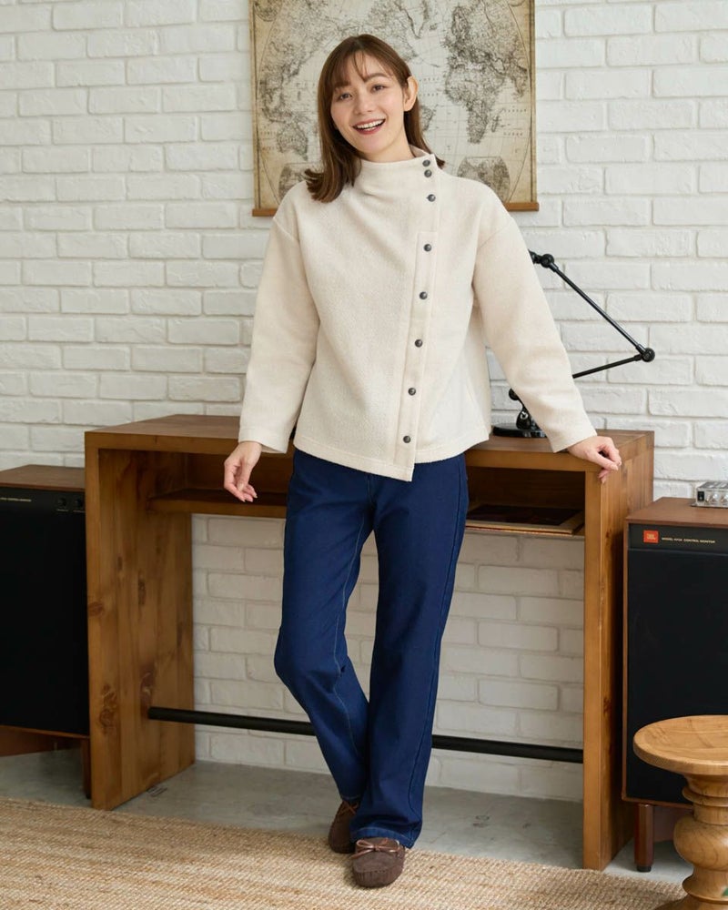 ブークレー調のジャカードを使用したボトルネックのプルオーバー。斜めに切り替えた前身とボタンデザインが印象的な一枚です。 モデル身長: 171 cm 着用サイズ: M サイズ Golden Bear WOMEN カットソー (WOMEN) 【着用アイテム】467QD710 ストレートパンツ