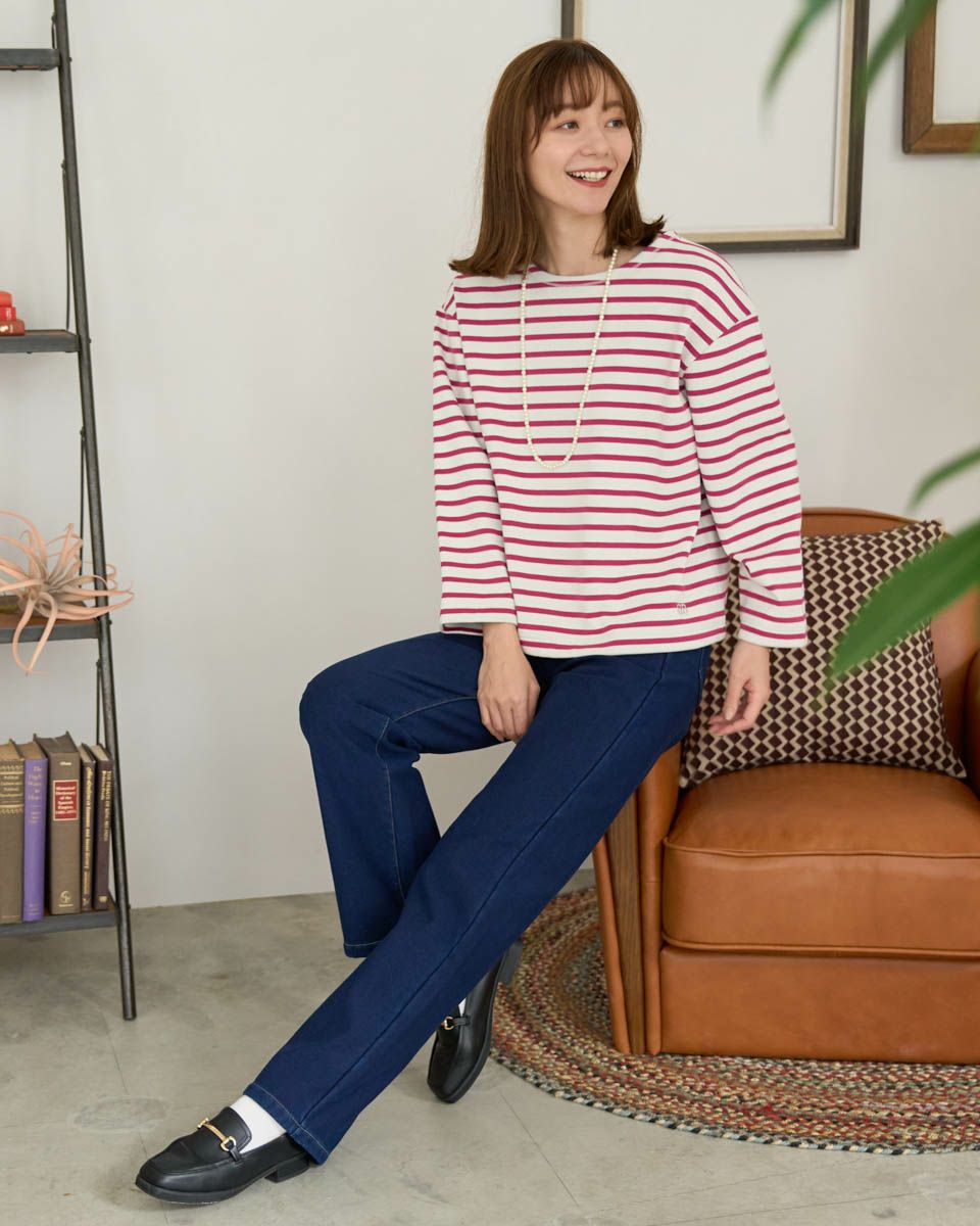 裏にシャギーフリースをボンディングしたボーダーTシャツ。明るく軽めな印象ですが裏のシャギーのタッチがソフトで暖かく、寒い時期におすすめのアイテムです。フューシャピンクとエメラルドグリーンのボーダーカラーもポイントです。 モデル身長: 171 cm 着用サイズ: M サイズ Golden Bear WOMEN カットソー (WOMEN) 同デザイン大きい(3L,4Lサイズ)はこちら 【着用アイテム】467QD710 ストレートパンツ