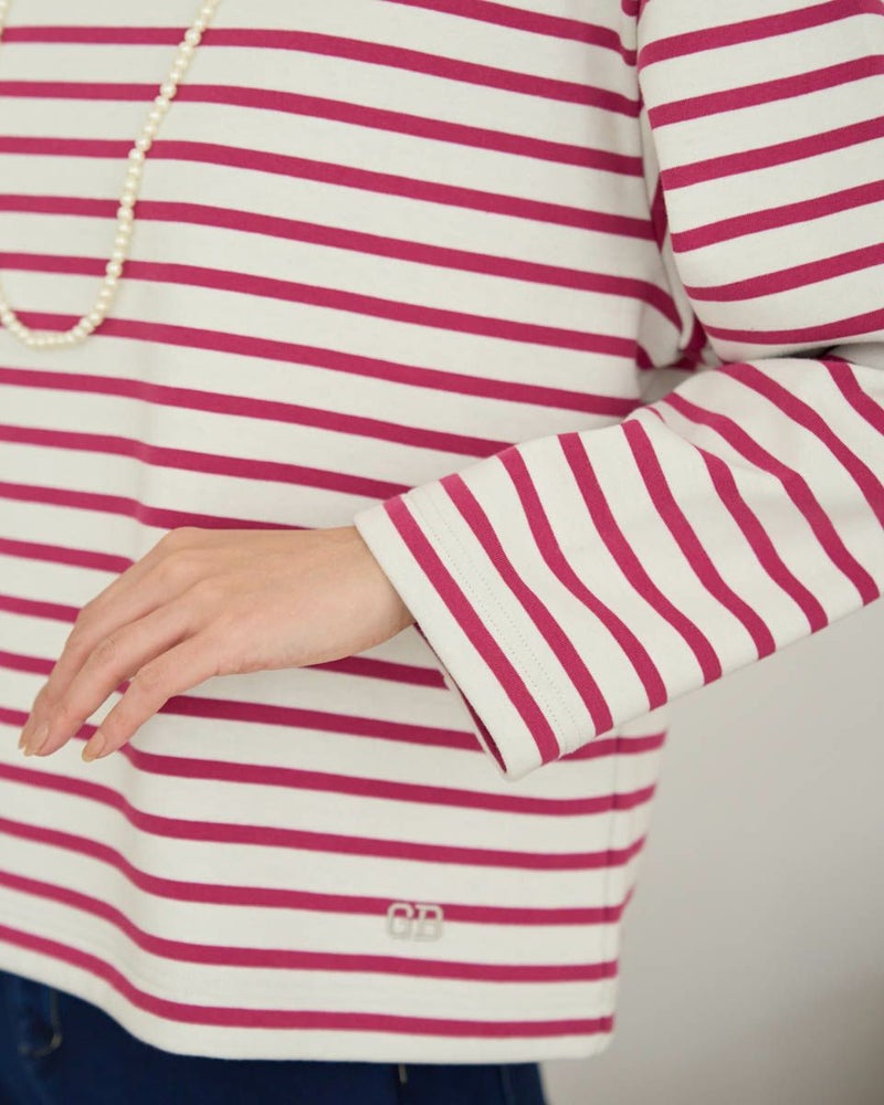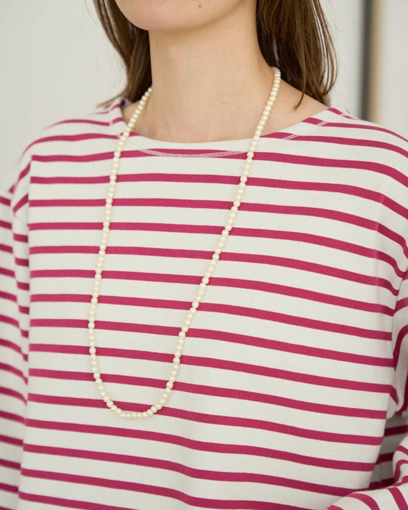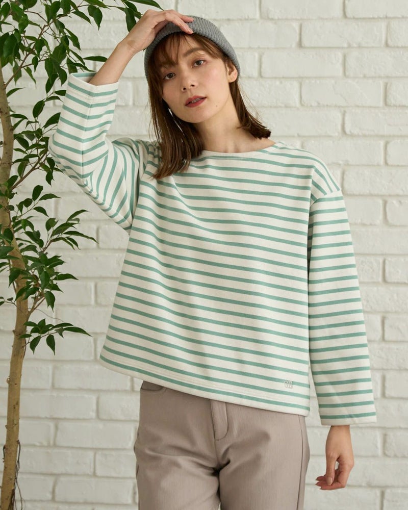 裏にシャギーフリースをボンディングしたボーダーTシャツ。明るく軽めな印象ですが裏のシャギーのタッチがソフトで暖かく、寒い時期におすすめのアイテムです。フューシャピンクとエメラルドグリーンのボーダーカラーもポイントです。 モデル身長: 171 cm 着用サイズ: M サイズ Golden Bear WOMEN カットソー (WOMEN) 同デザイン大きい(3L,4Lサイズ)はこちら 【着用アイテム】467QD710 ストレートパンツ
