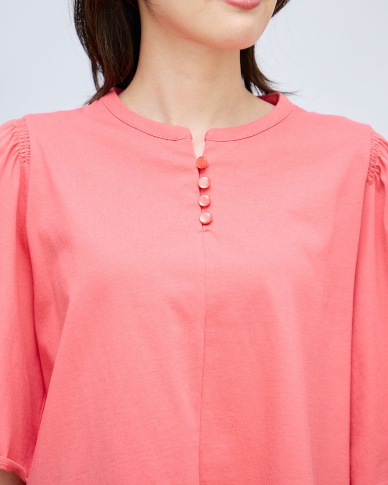 オーガニックコットン100%の天竺を使用した5分袖のデザインカットソーです。優しく広がるフレア―スリーブと肩のギャ