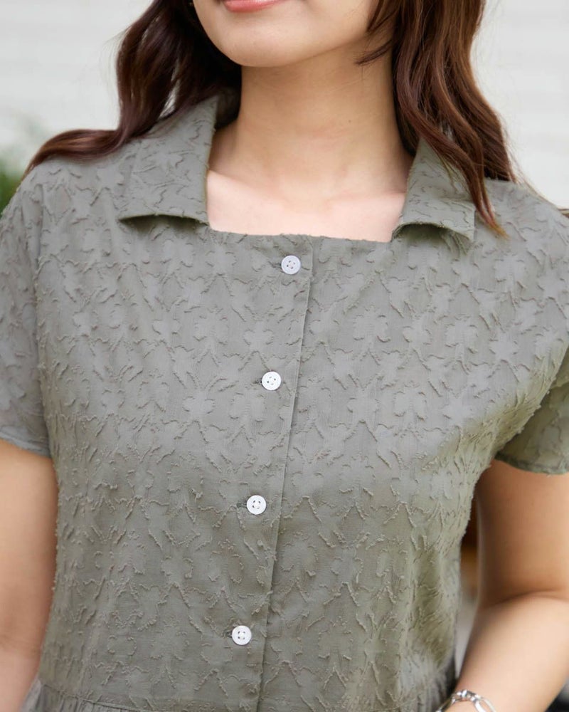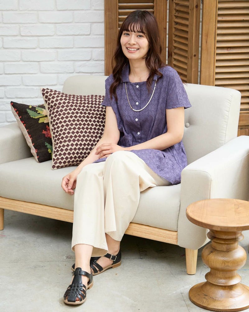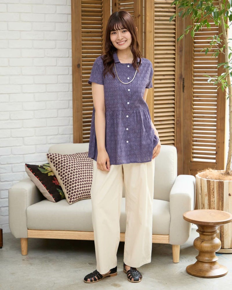 表情のあるカットジャカードを使用したペプラムブラウスです。インド綿なので軽く柔らかな風合いです。前開きなのでタンクトップとのレイヤードもおすすめです。